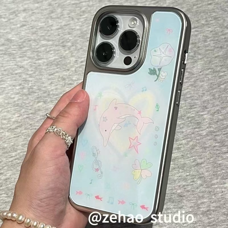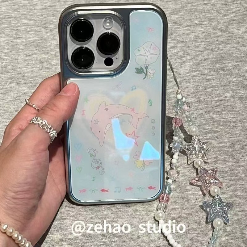【速達!】insシルバーサイドメッキ星付きピンクイルカ対応iPhone 16 promaxアップル15ケースケース14