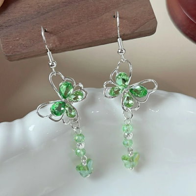 ハヌルハヌルエメラルドグリーンストーンのちょうちょピアス フックピアス 蝶々 ピアス チェーン 揺れる ゆらゆら ぶらぶら シルバー 緑 グリーン かわいい レディース 女性 春 夏 ちょうちょ