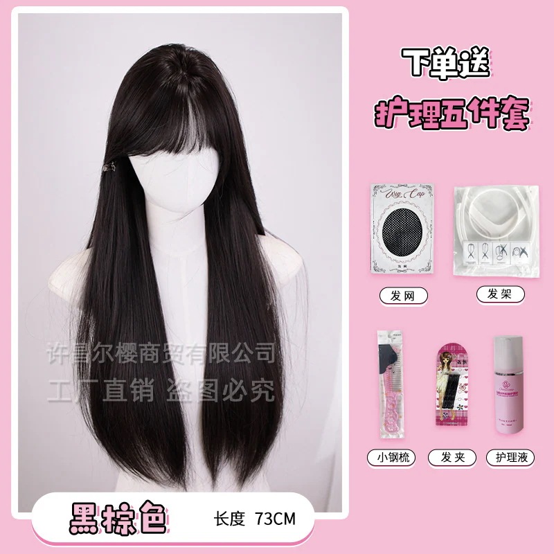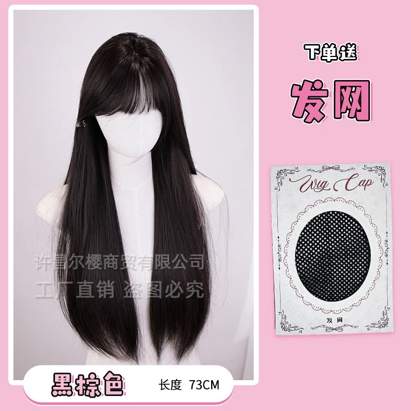 夏の新作女性用ウィッグ 自然な前髪付き黒ロングストレート 丸顔用フルウィッグ