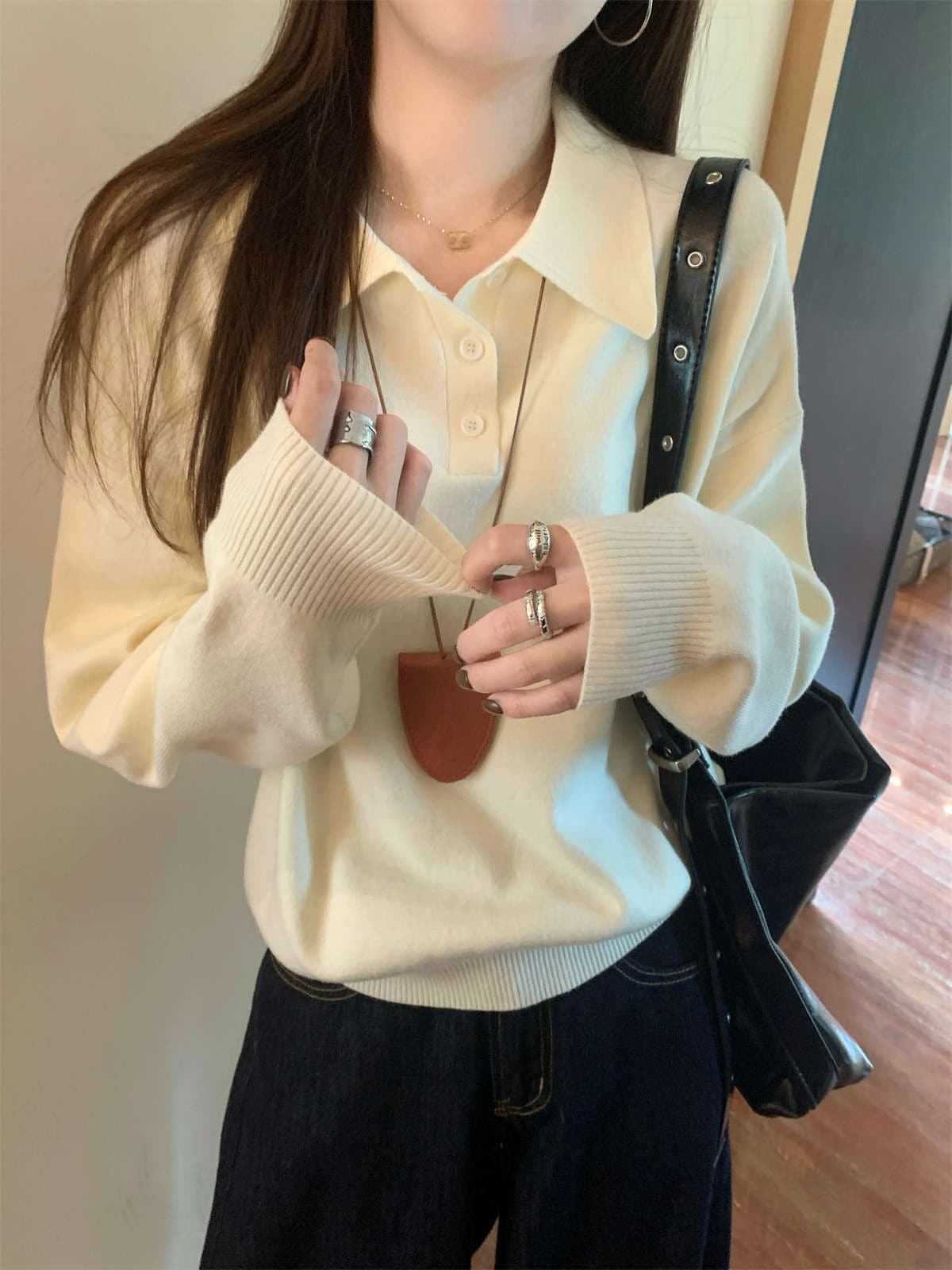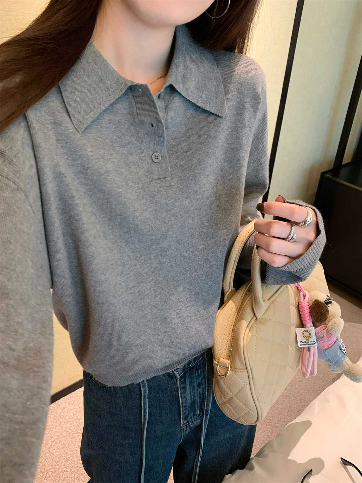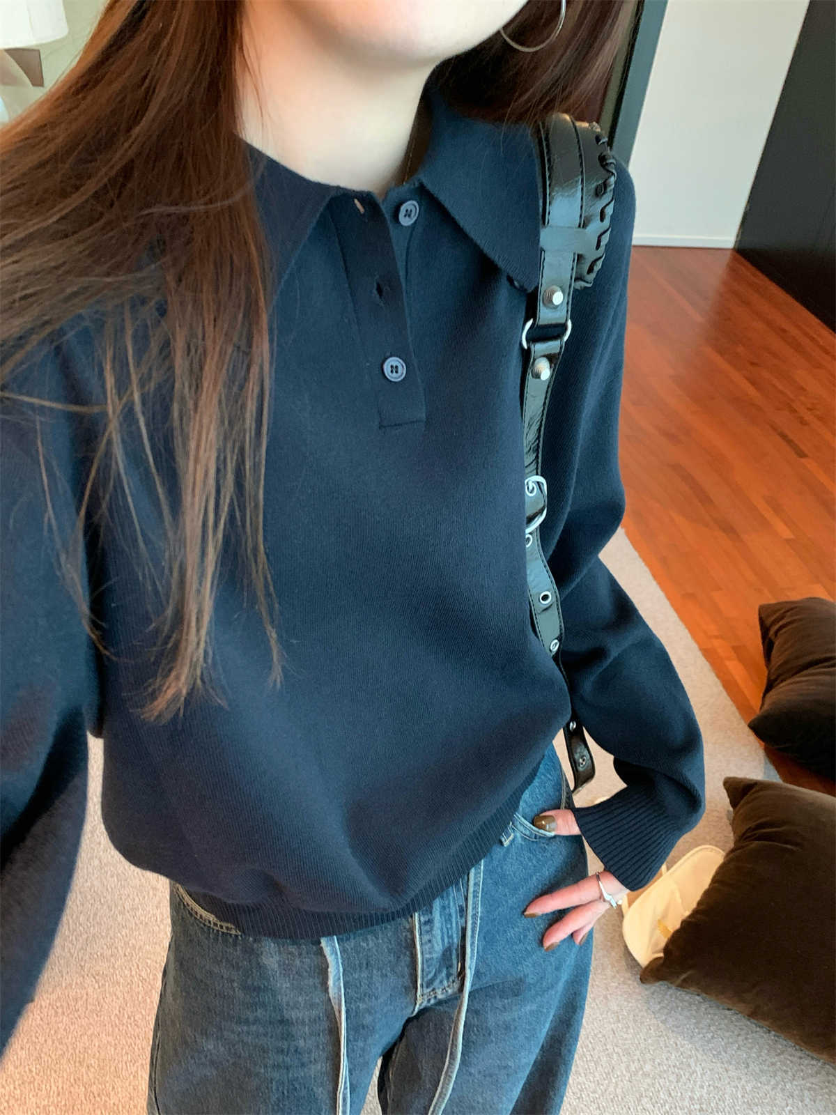ポロ襟ニット カレッジ風ポロネックセーターストレートショルダー長袖ニットトップス