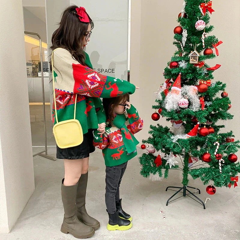 新作 秋冬韓国風 親子服母女装 クリスマスツリー 女の子 セーター 子供 洋風 ニットウールトップス クリスマス限定2点セット