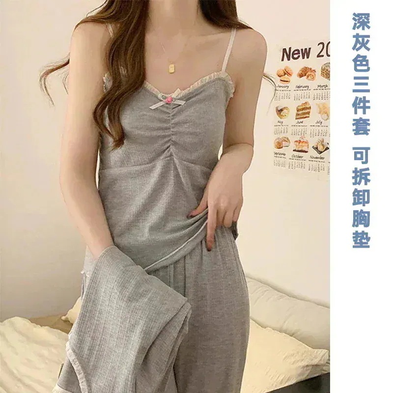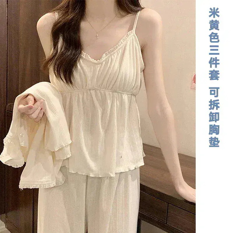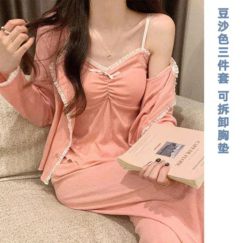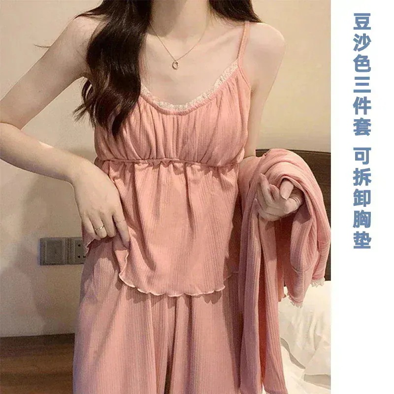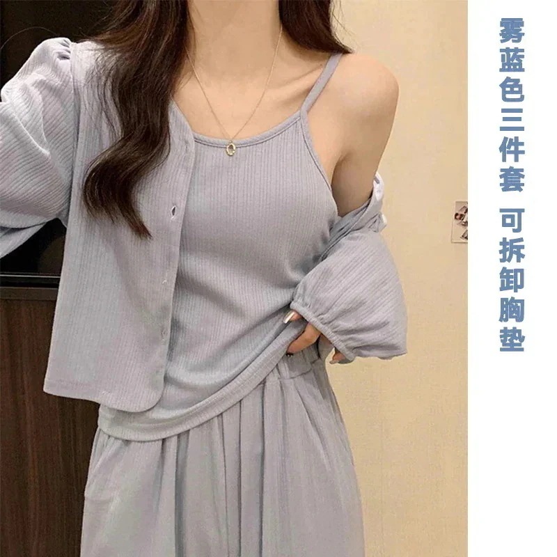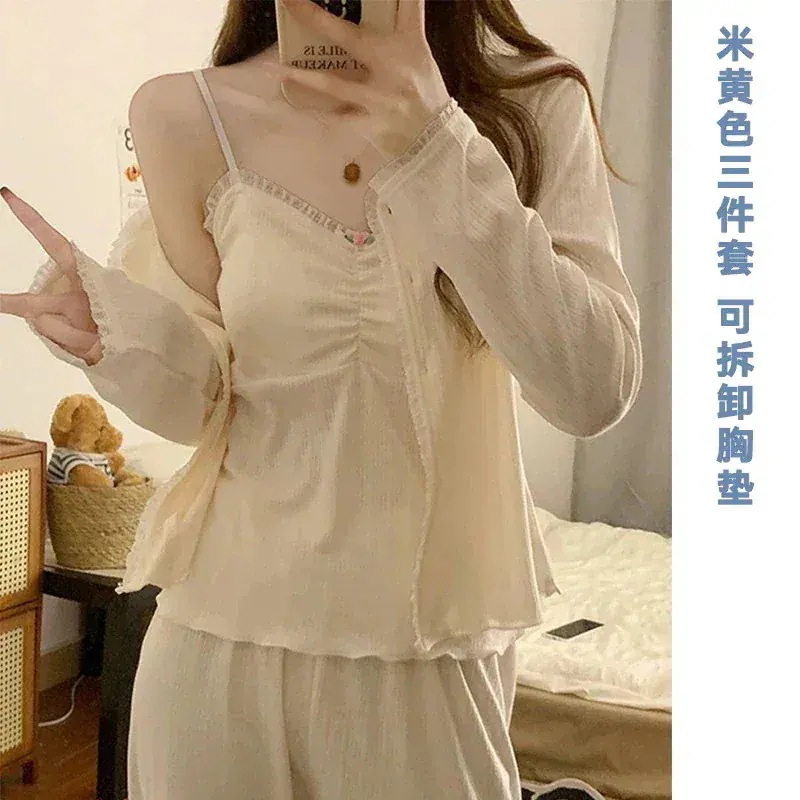 ルームウェア 春秋 長袖2025 キャミソール パジャマ 部屋着セット ゆったり 胸当て付き 3点セット