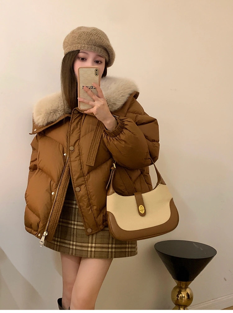 大きな毛皮の襟付き小柄なダウンジャケット女性用冬物 2024年新作韓国風ドローストリングショート丈綿入れコートダウンジャケット