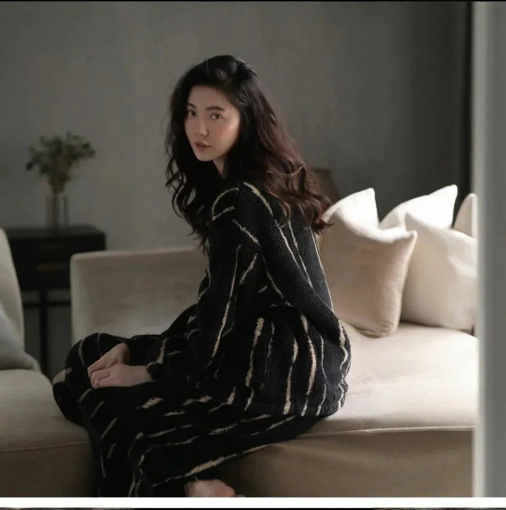 新作パジャマ レディース秋冬季コーラルフリース増量起毛厚手フランネルホームウェア 着用可 黒 V ネックカーディガンスタイル