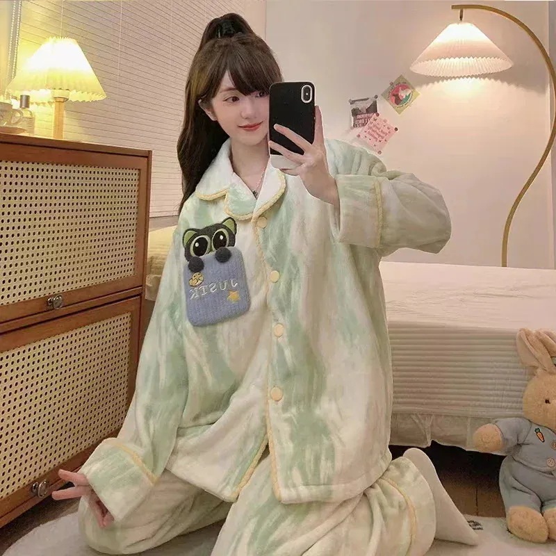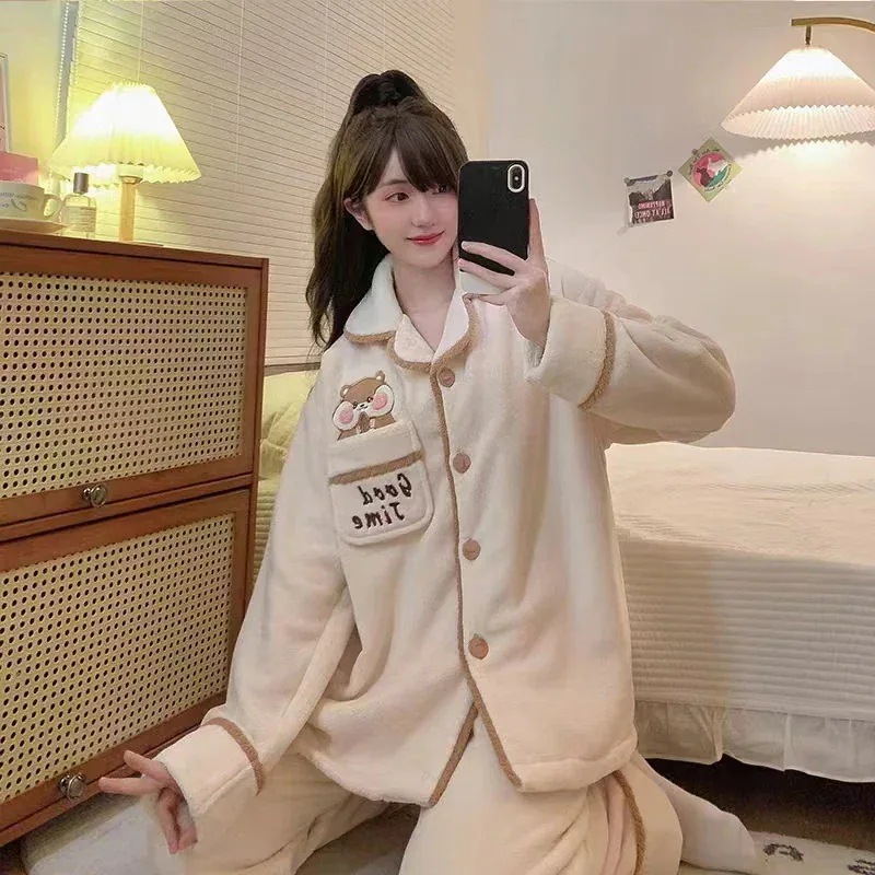 2025 新作秋冬季コーラルフリースパジャマ レディースキャラクター保温フランネルホームウェアセット 着用可
