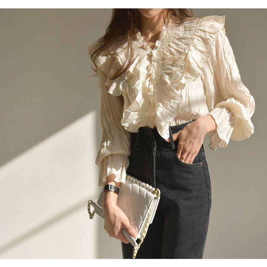 【本日限定】プリーツ 通勤 おしゃれ シャツ ブラウス シフォン フレア フリル vネック ブラウス 夏 春 レディース ブラウス 可愛い 大人 今っぽシアーシャツ韓国ファッション