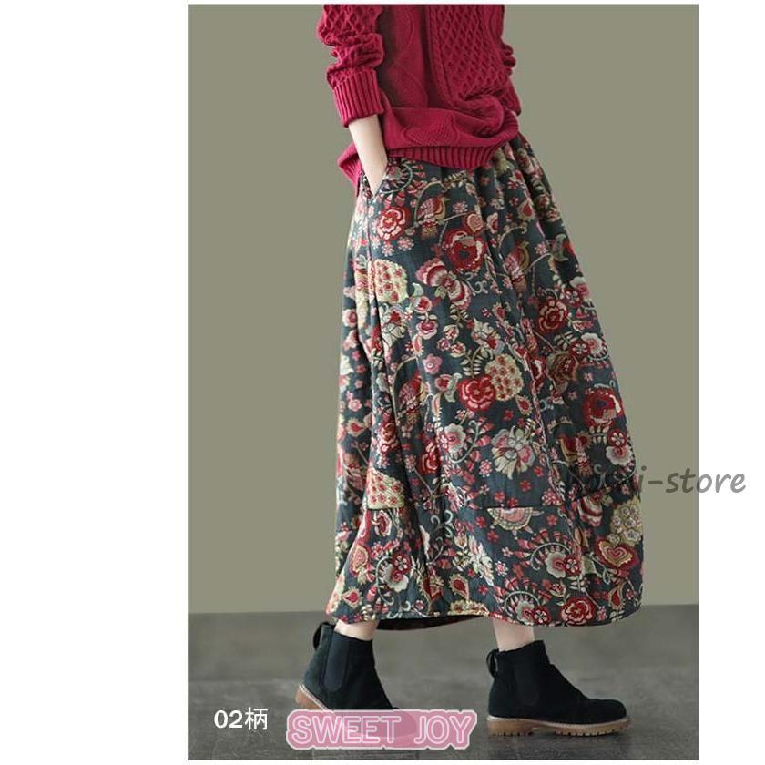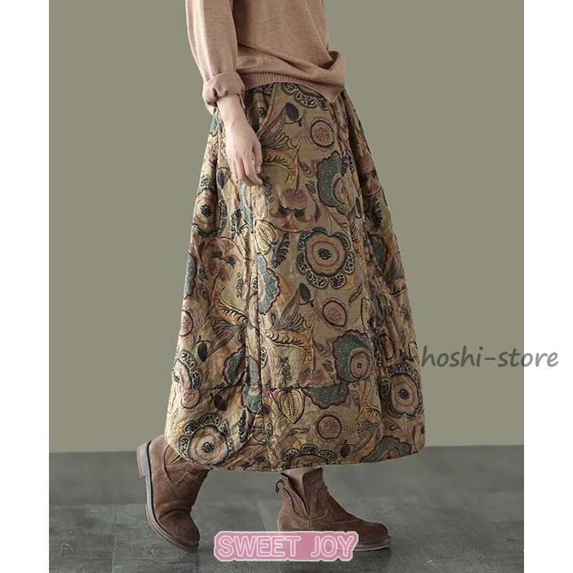 スカート ロングスカート コクーンスカート 花柄 フレア 中綿 ボトムス レディース 大きい 体型カバー 冬 ウエストゴム ロング丈 秋冬