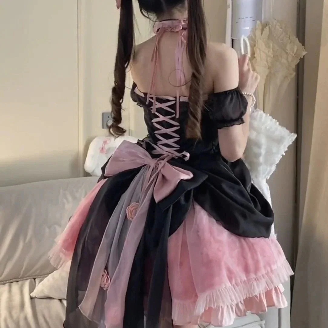 ロリータピンクローズロリータブラックパウダー甘辛プリンセス風ウエストフィッシュボーンスカートロリータ