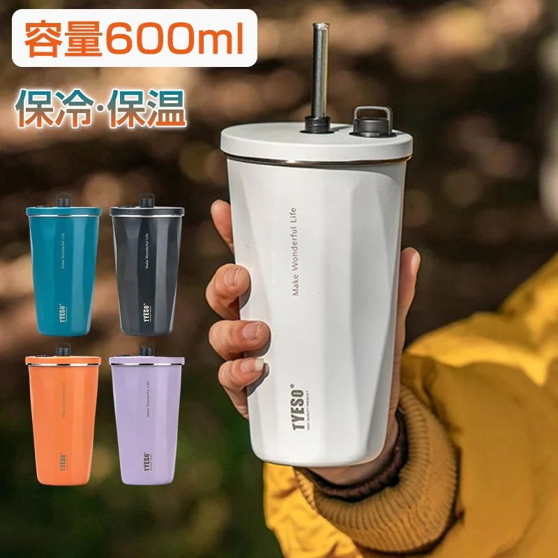 タンブラー 水筒 ストロー付き 600ml 蓋付き 大容量 真空断熱 保温 保冷 持ち運び マグボトル 直飲み 二重構造 ステンレス コーヒーカップ 車載せでき おしゃれ
