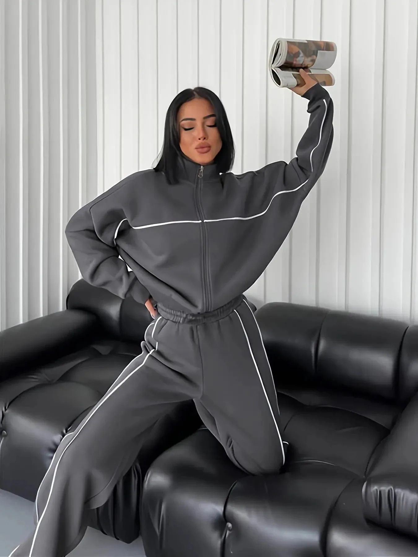 2025年新作カジュアルセット 長袖ハイネックカーディガン&紐付きストライプパンツセット