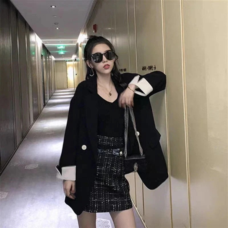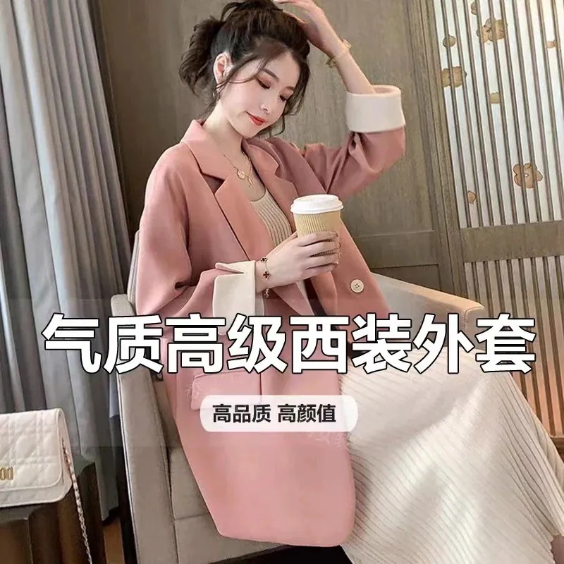 韓国風ピンクのショートジャケット 女性用ダブルボタンゆったりシルエット 春秋用カジュアル万能トレンチコート・スーツカラージャケット・ウールコート