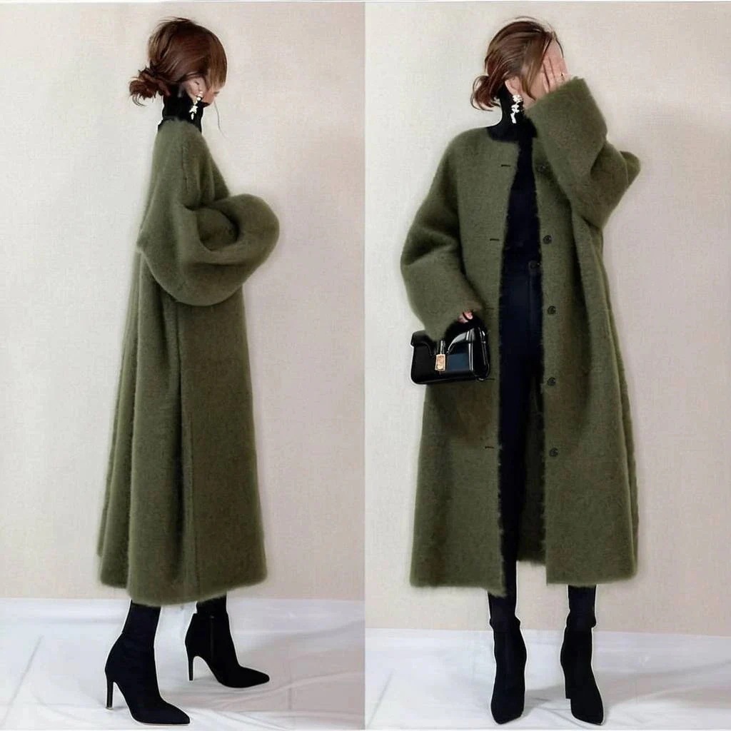 ツイードクルーネック長袖ロングコートパーカー・ブレザーネックコート・ツイードコート