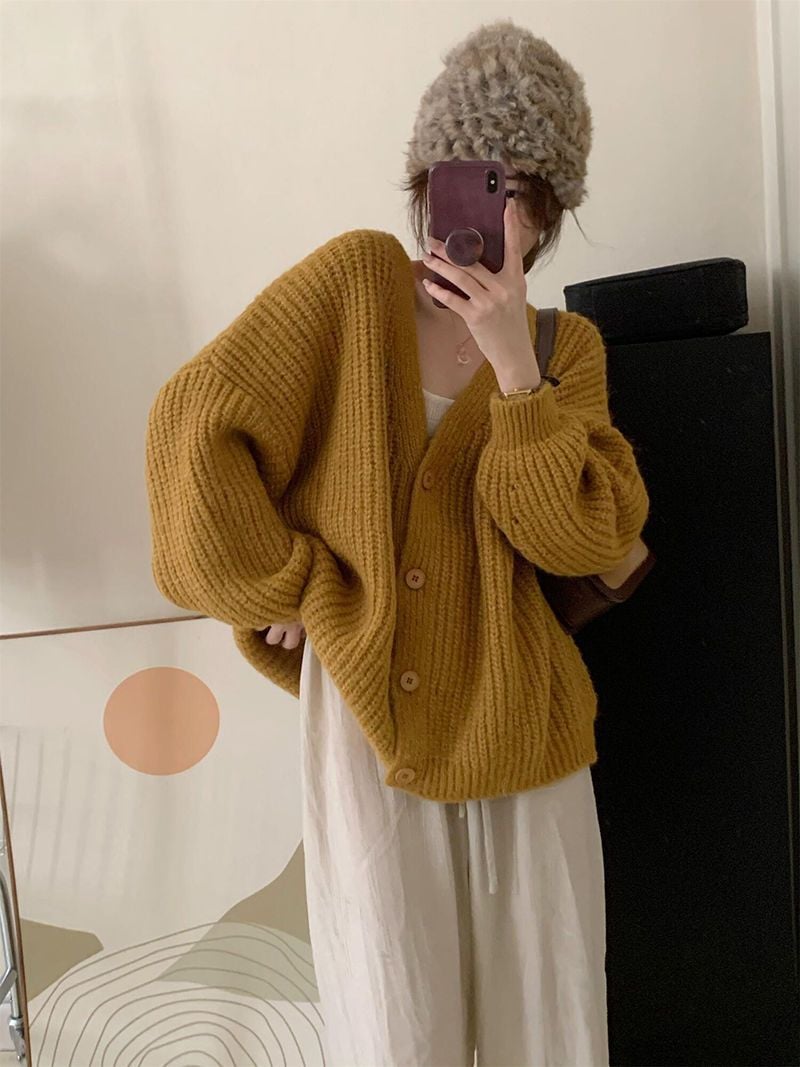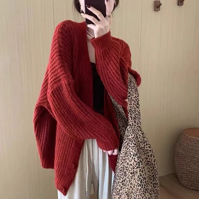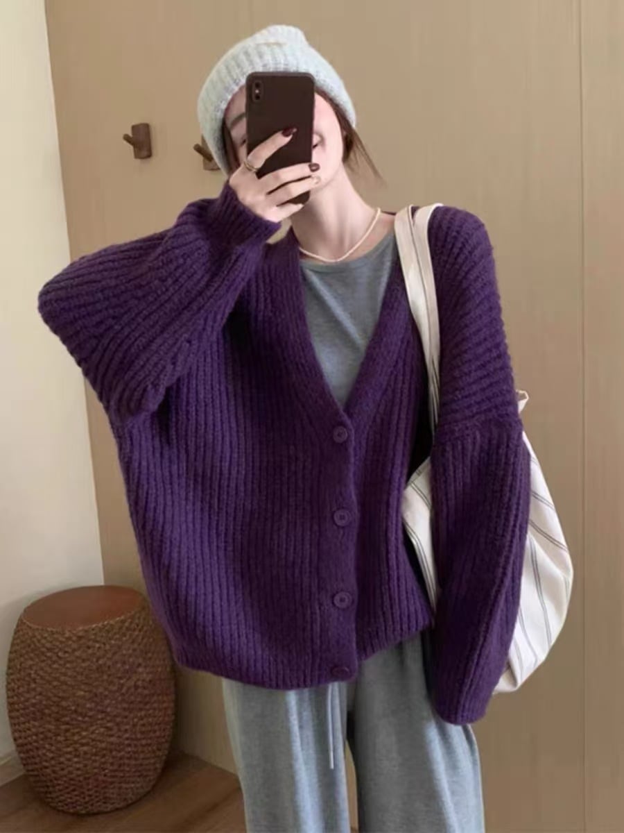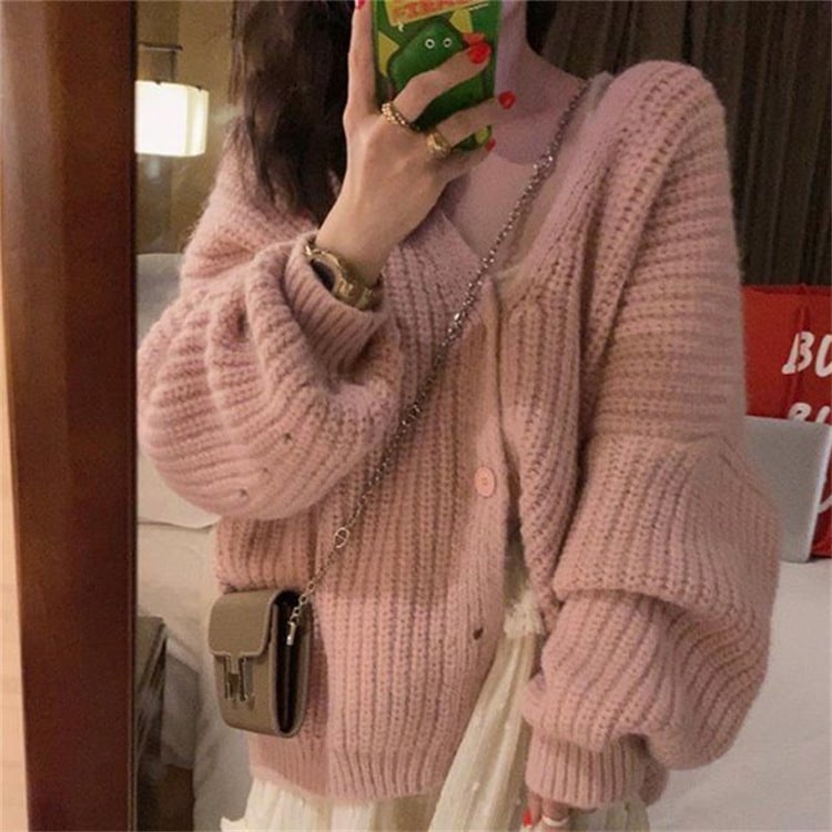 2025ピンクVネックカーディガンレディース アウターはゆったり甘ニットのけだるい風コート長袖ニットカーディガン