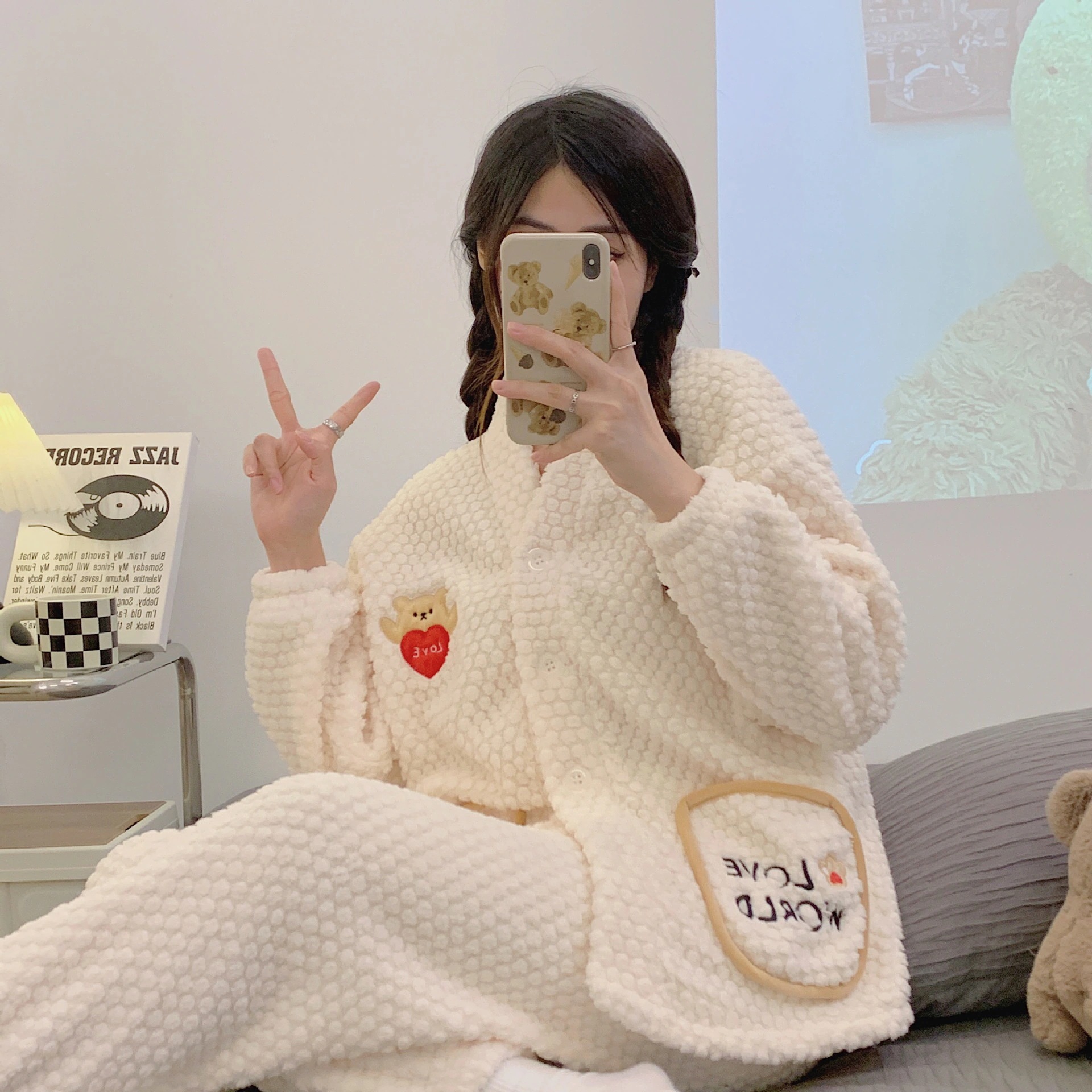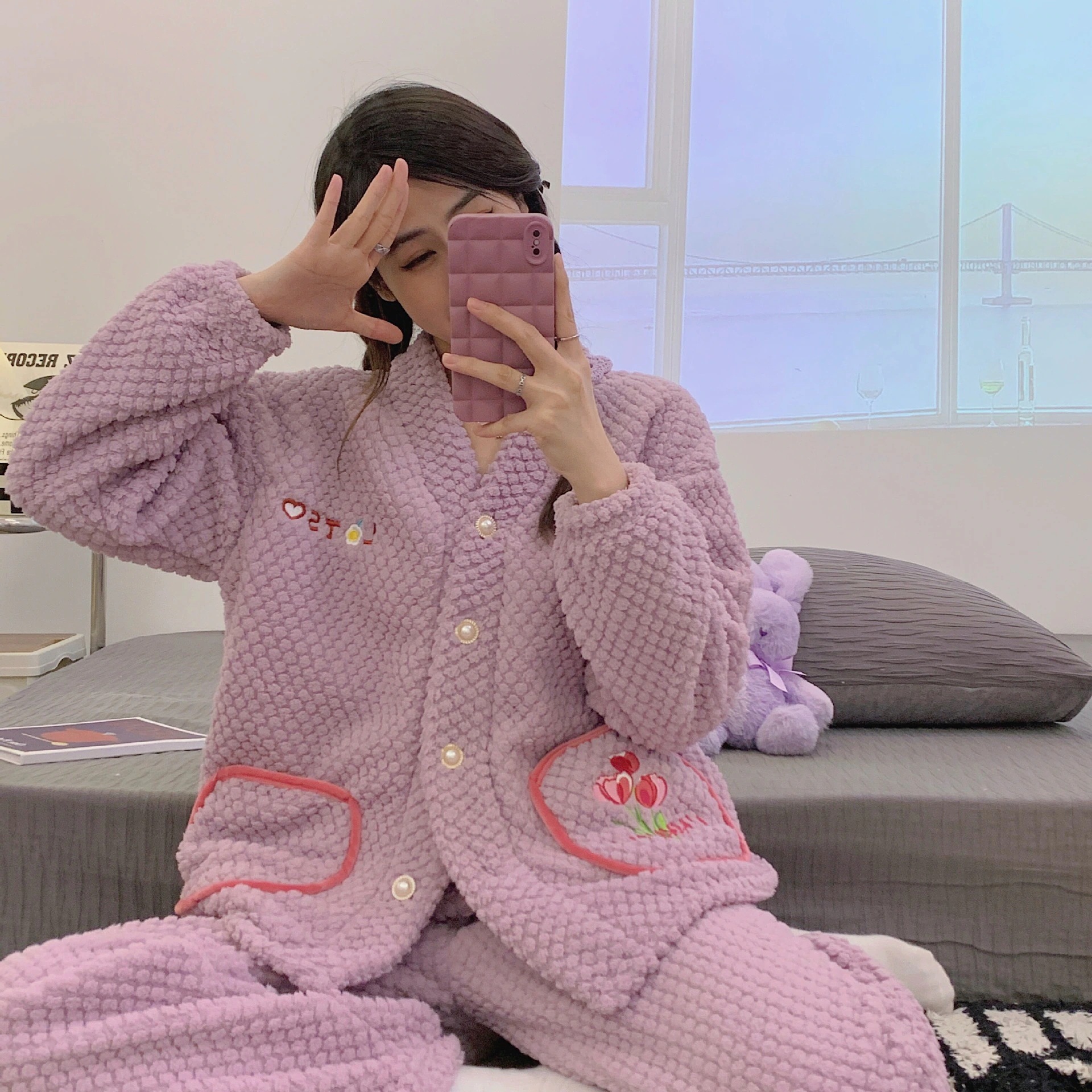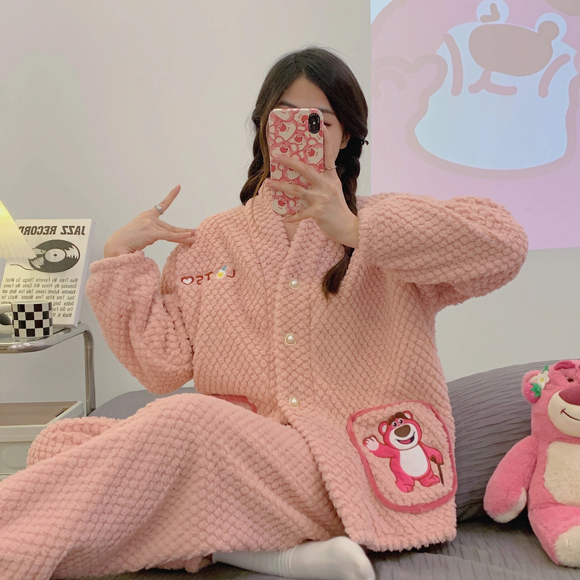 クロスボーダー冬季レディースローズベロアパジャマ 増量起毛 カーディガン型 キャラクタースウィート ホームウェア 2 点セット アウトドア可