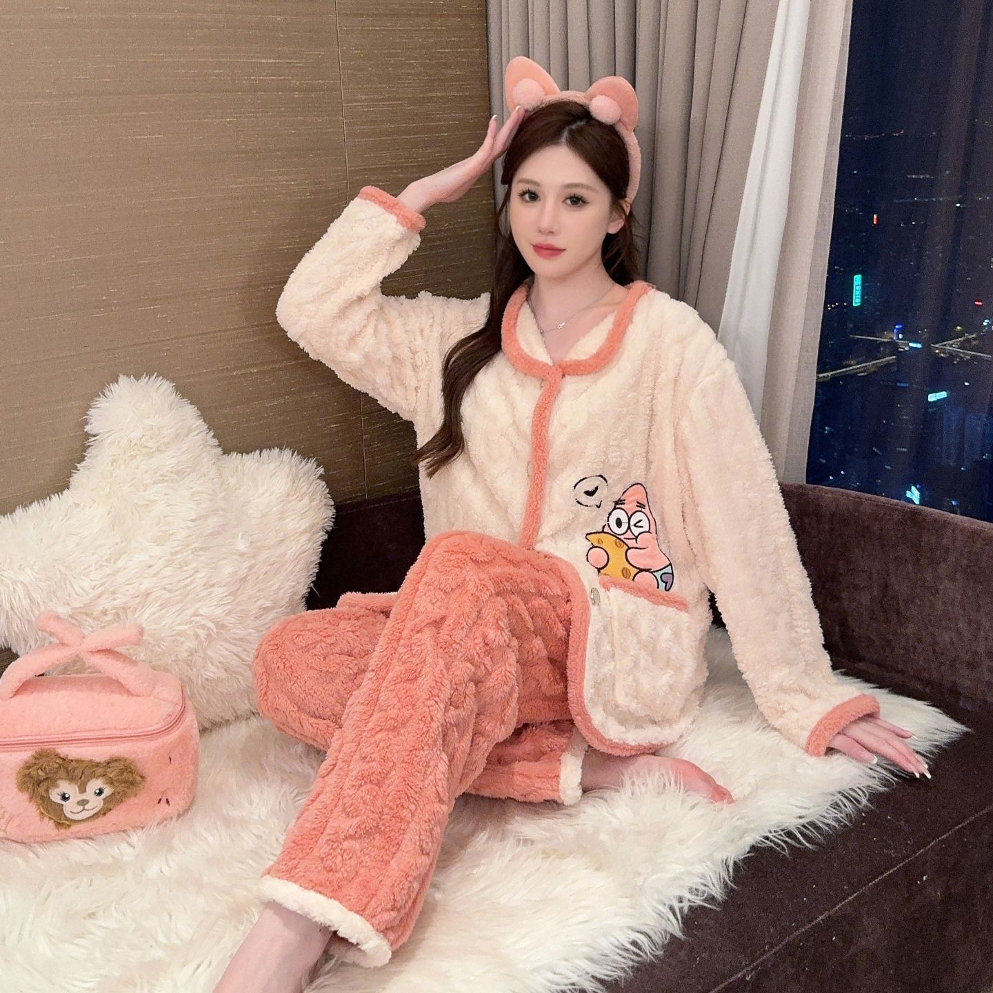 冬季レディースカットパイルベロアパジャマ 増量カーディガン 小スタンドカラー長袖 ヒット商品 保温起毛 ホームウェアセット