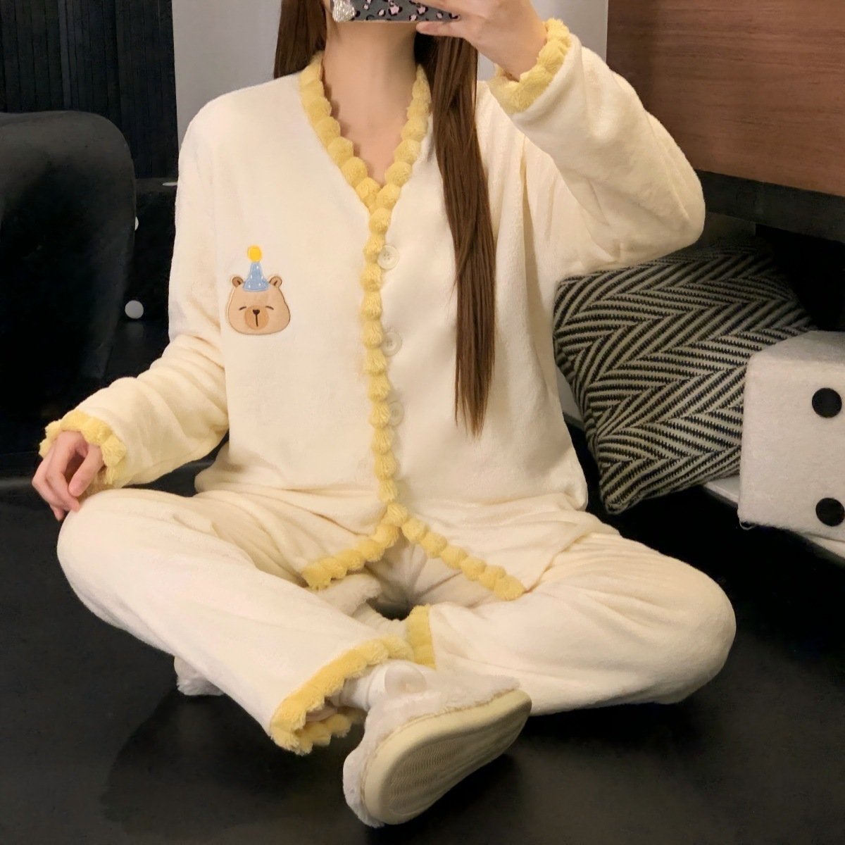 冬季レディースフリースパジャマ 長袖増量起毛 カーディガン型スウィート スクールスタイルホームウェアセット