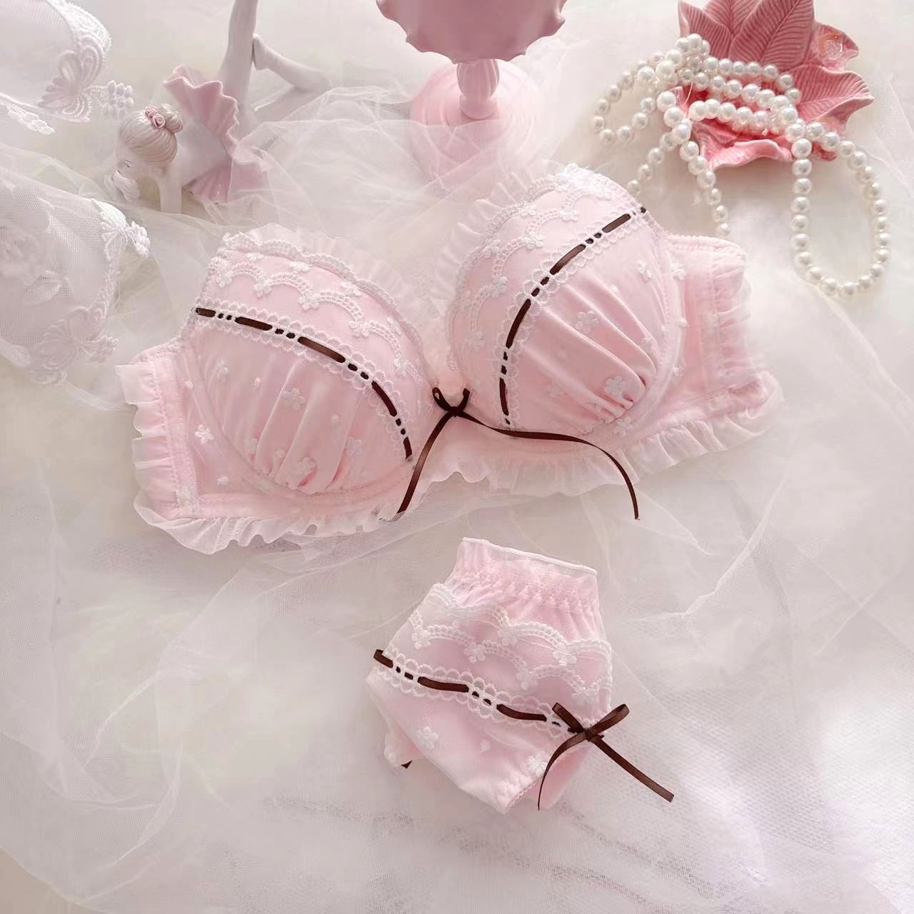 可愛いセット下着 新調したい!ナイトブラ 人気ブラジャー 新鮮な日本リボン刺繍学生女の子かわいいギャザー セクシーな下着ブラ セット