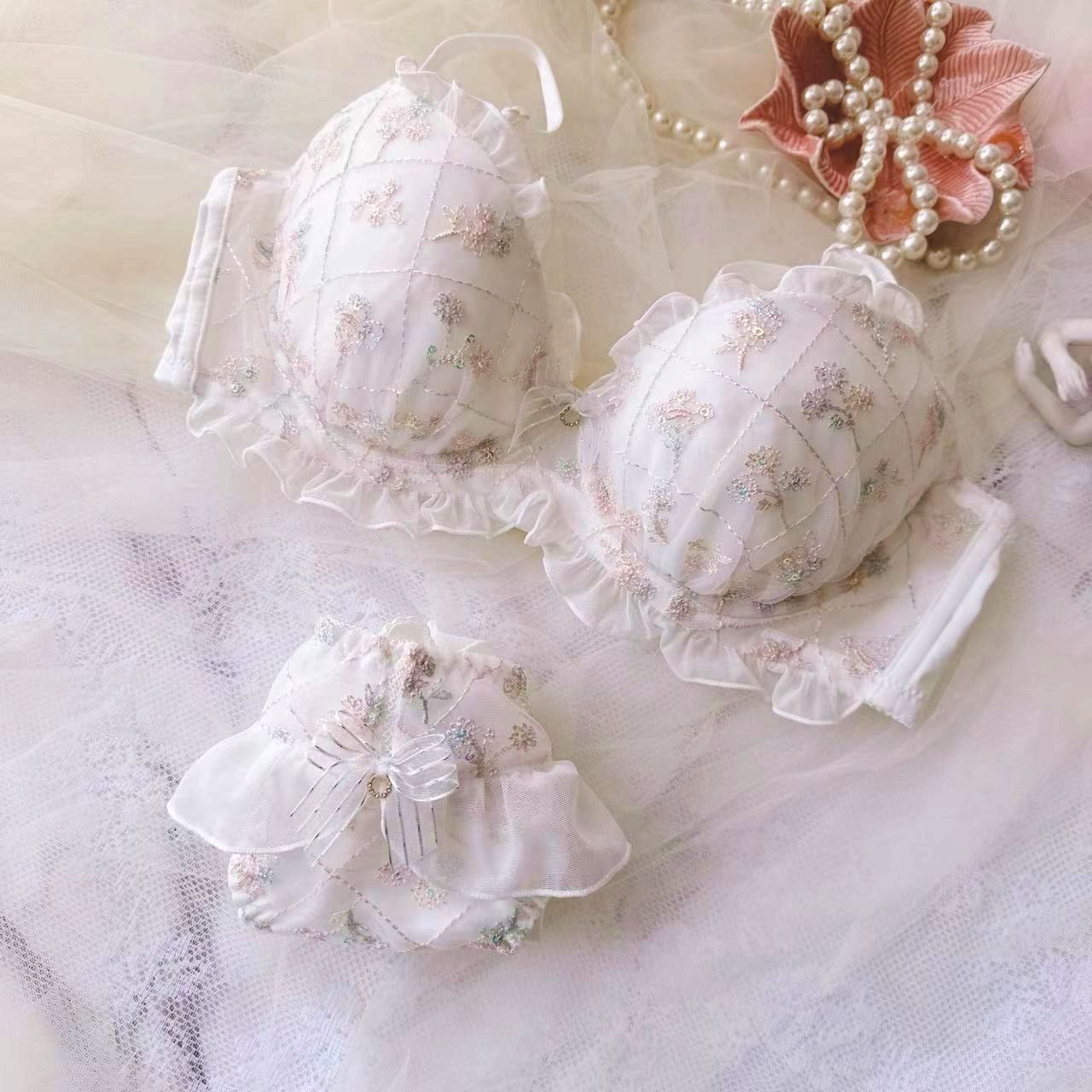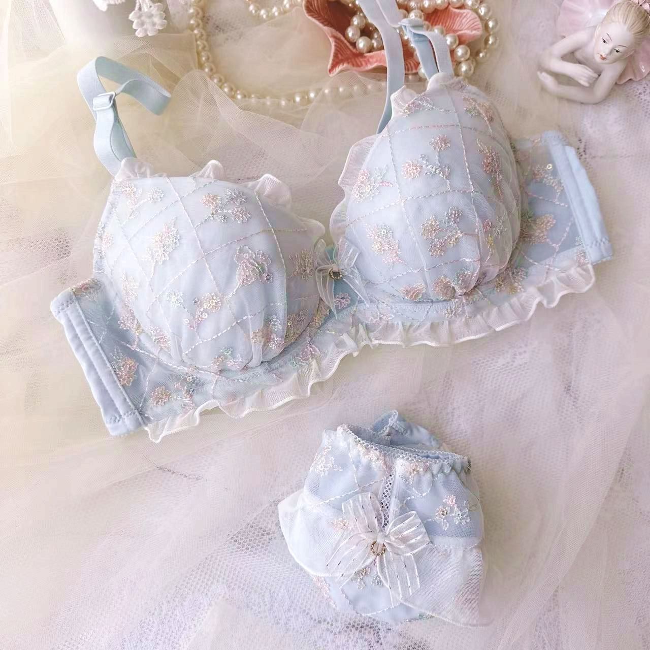 可愛いセット下着 新調したい!ナイトブラ 人気ブラジャー 日本の三色スパンコール刺繍学生女の子かわいいギャザーセクシーランジェリーブラセット