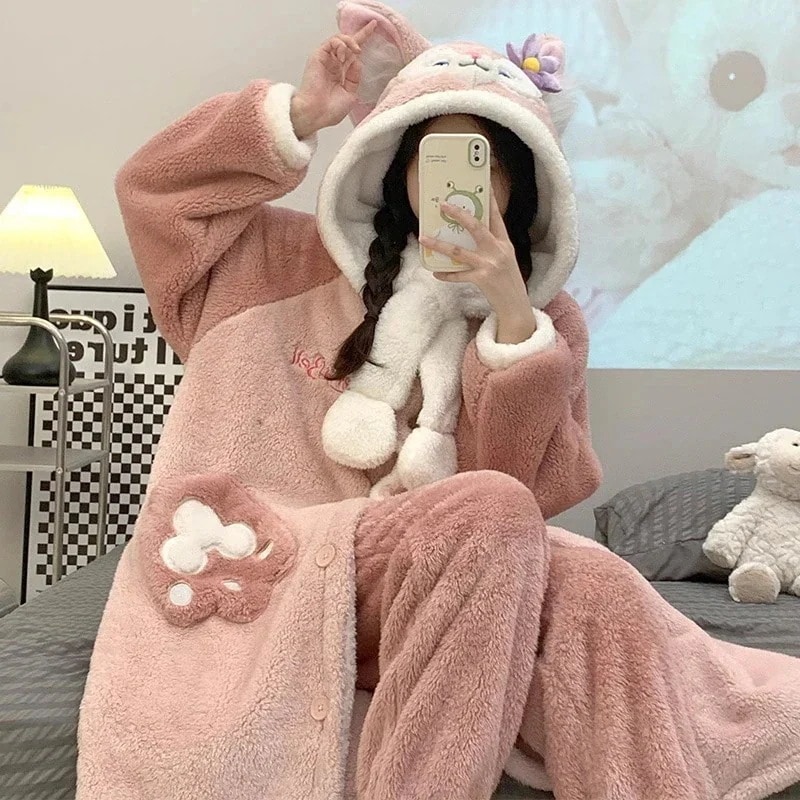 着ぐるみパジャマ ルームウェア パジャマ コーラルフリースパジャマ女性用秋冬用裏地付き厚手保温冬用フード付き可愛いガウン