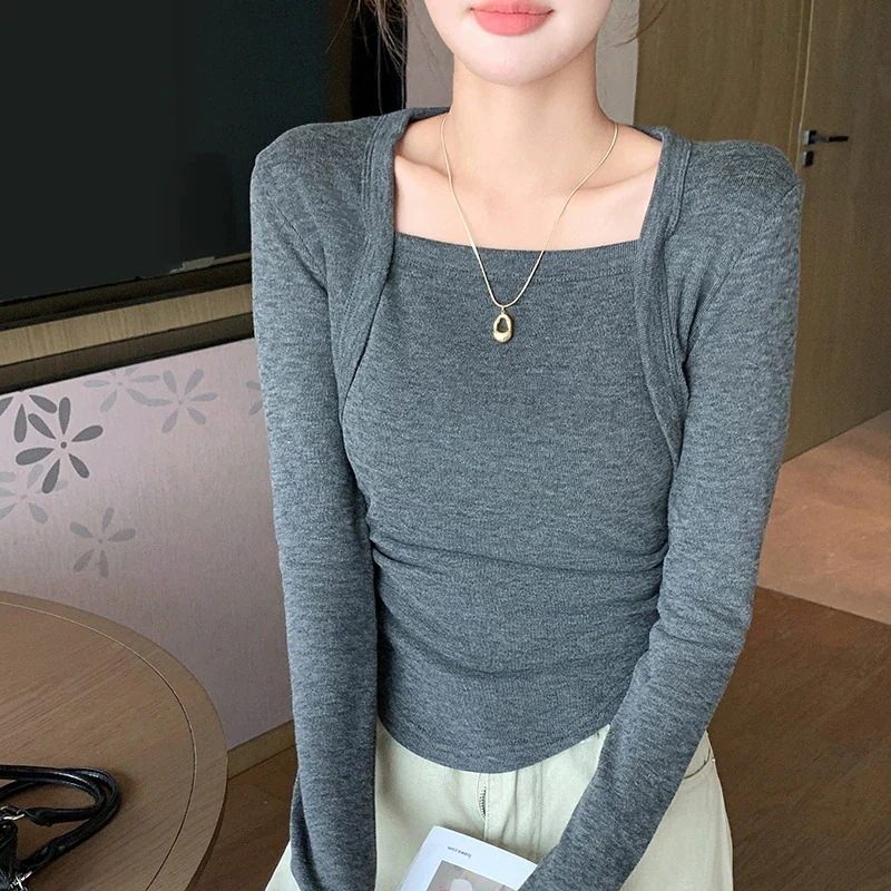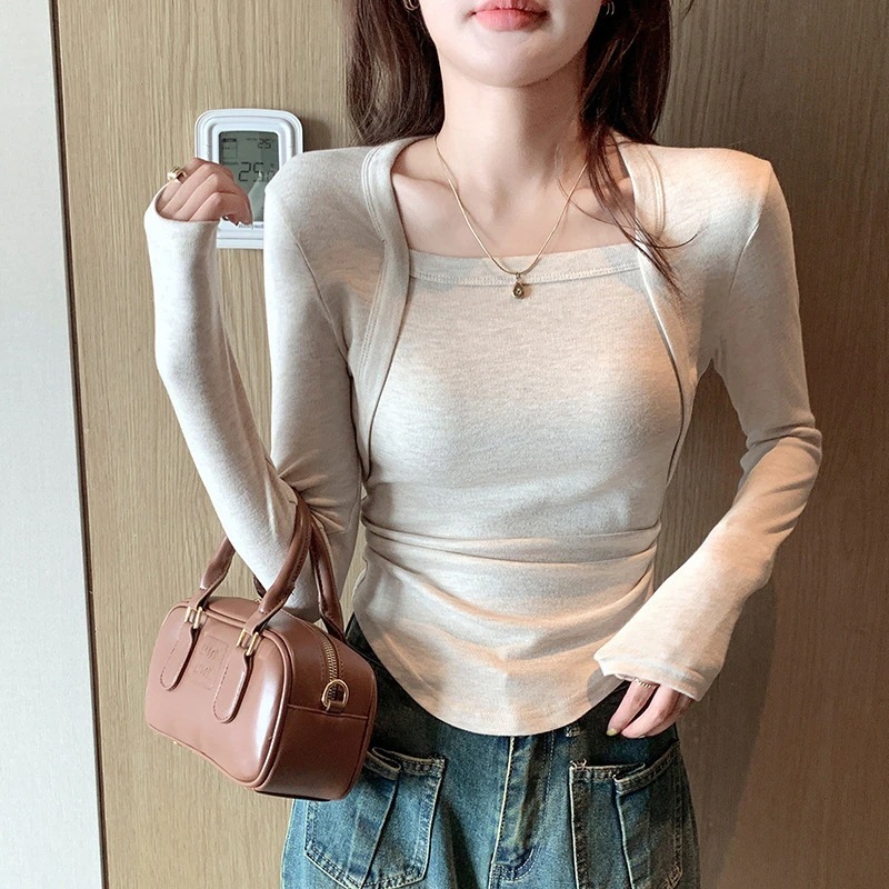 フレンチスリーブスクエアネックスリムシルエットフェイクツーピースレディースカジュアルトップス秋用薄手インナー