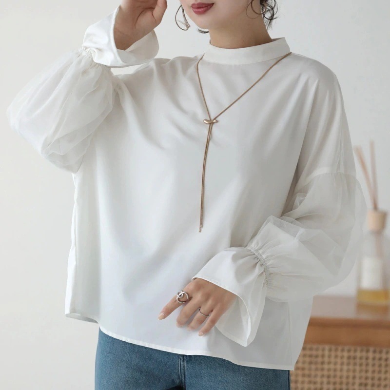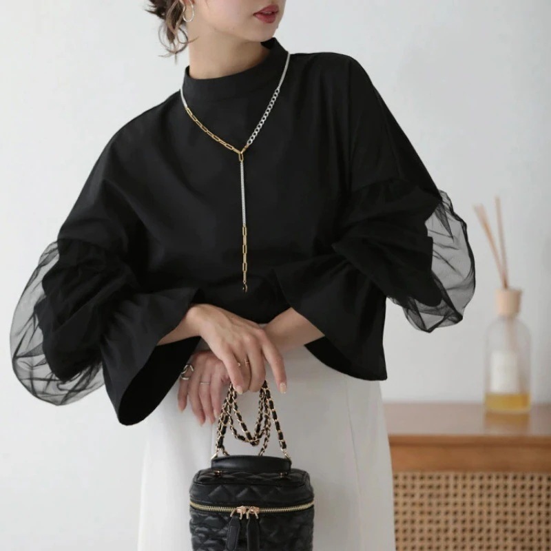 ヒット新作日系レディース春秋 メッシュパッチワーク長袖無地フェイクツーピースフレアスリーブシャツ