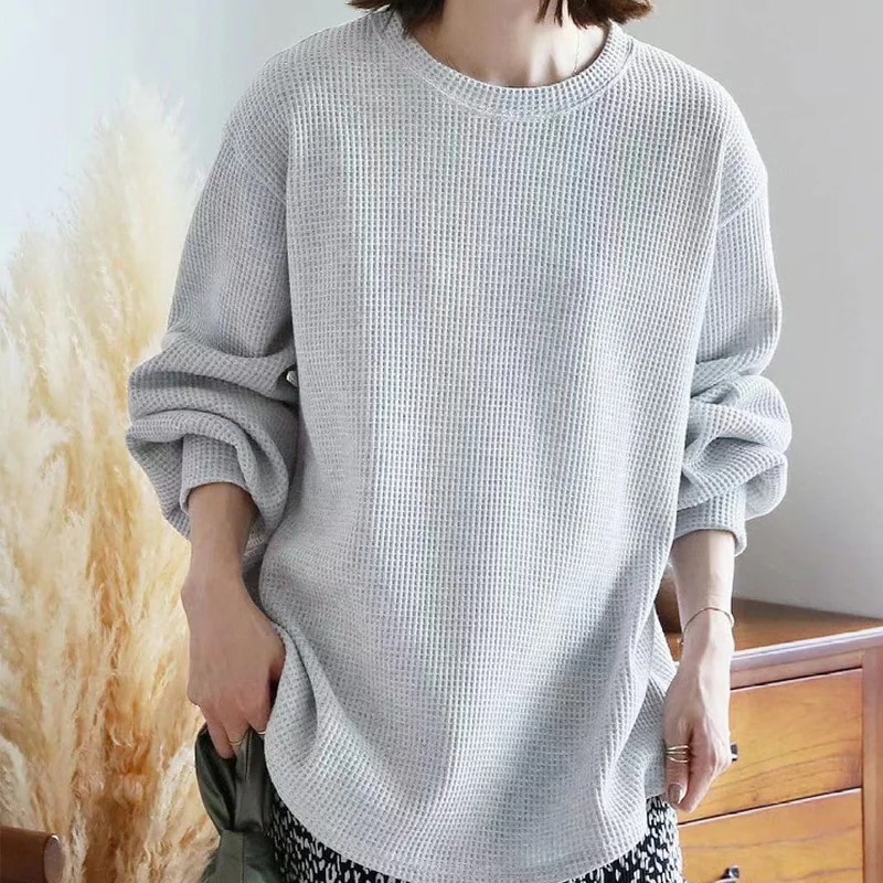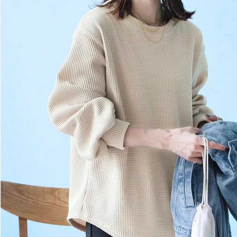 クロスボーダー輸出日系春季 リラックスドプラスサイズカジュアルスタイルレディース丸襟アシンメトリック無地ウォッフル柄スウェットトップス