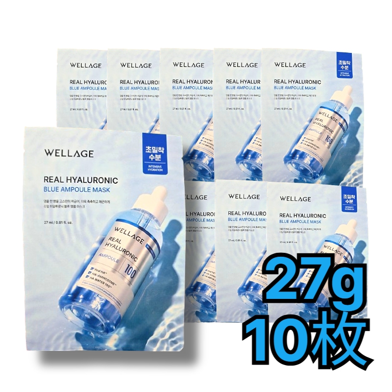 WELLAGE【うるおい集中ケア】リアル ヒアルロニック ブルー アンプル マスク 27ml×10枚 / 高保湿 ヒアルロン酸 マスクパック 乾燥肌ケア 男女兼用 韓国コスメ