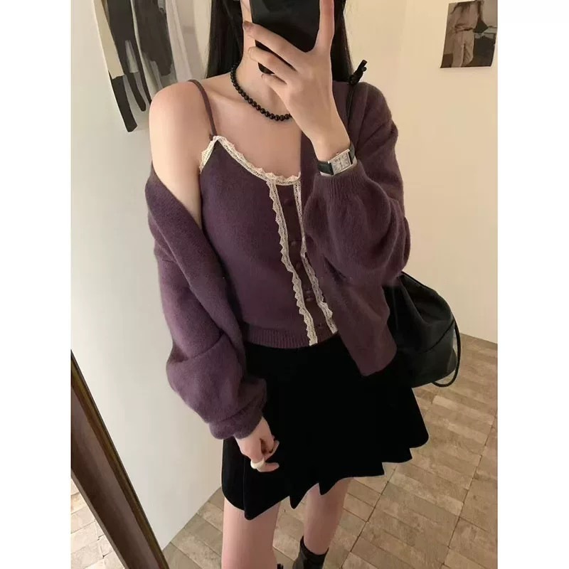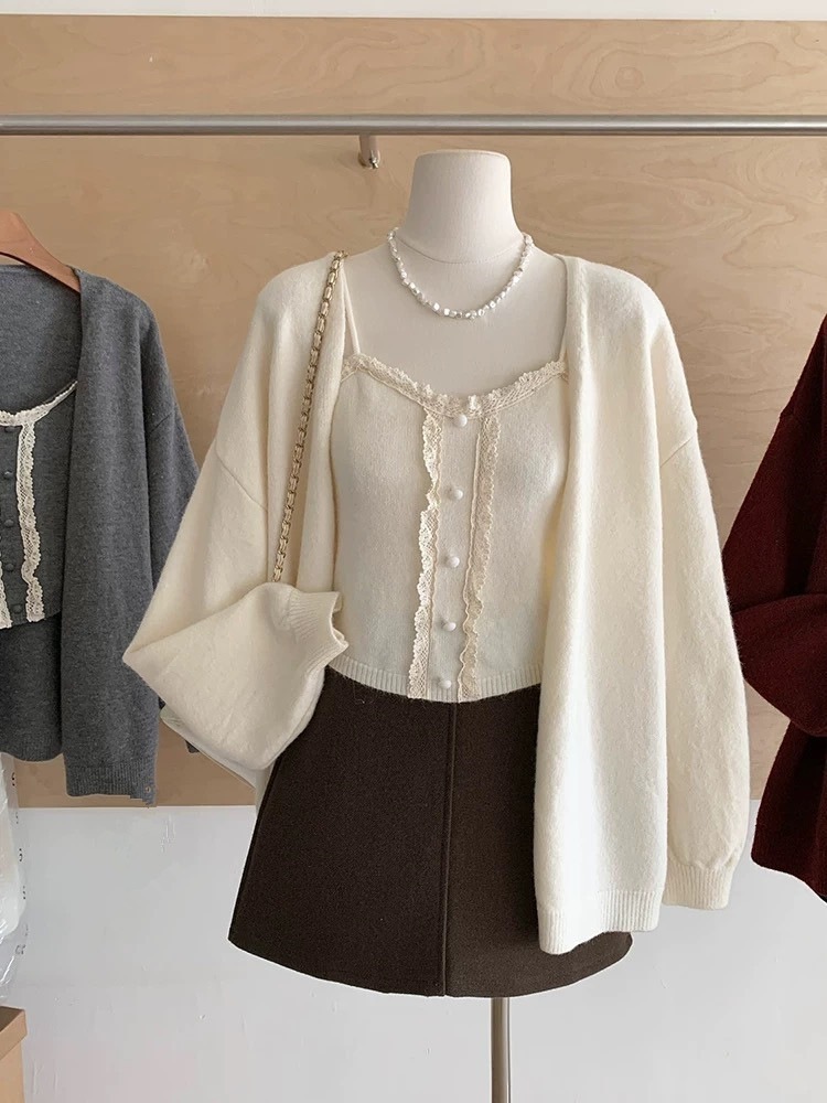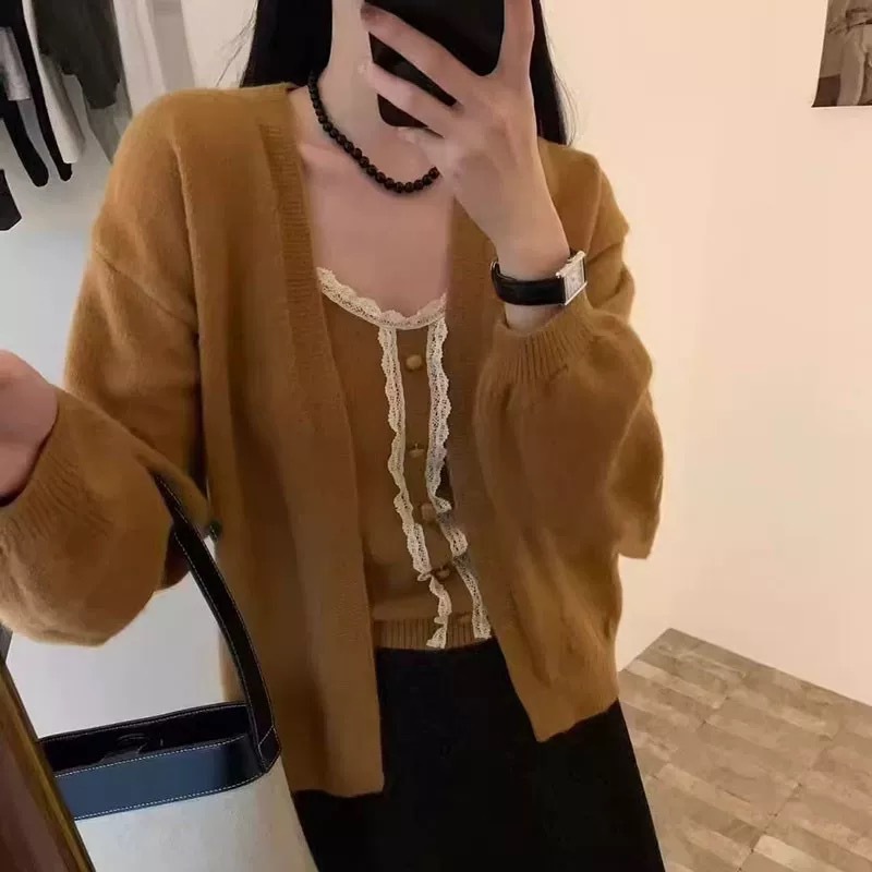 韓国風の万能な無地の長袖カーディガンセーターレディース秋冬新作レーストリムニットキャミソールセット重ね着