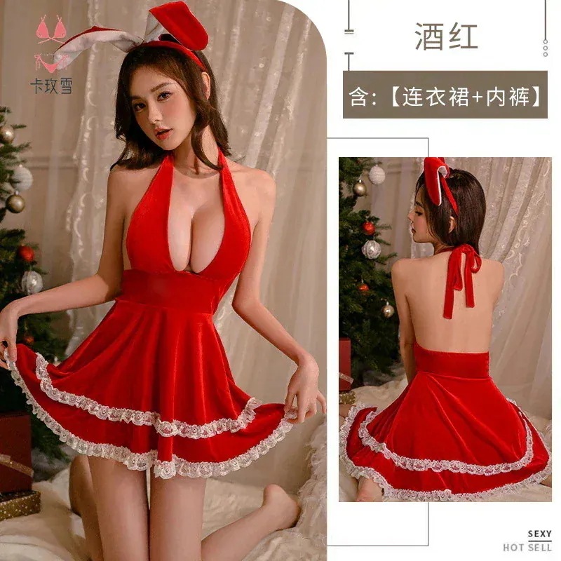 2025クリスマスサンタコスプレ デザイン エロ クリスマスドレス ランジェリー ネック 深いV 胸 セクシー レディース 制服の誘惑 韓国ファッション
