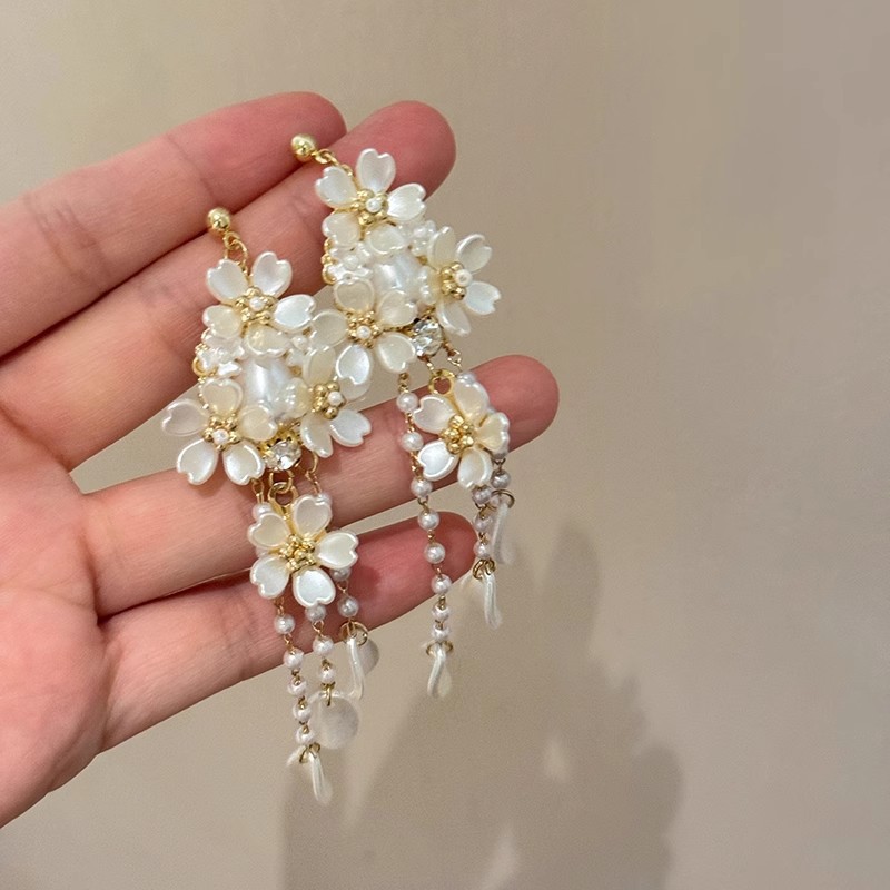 女性用バロック調の白い花びらのイヤリングエレガントなパールのタッセルスタッドイヤリング2025年の新スタイル