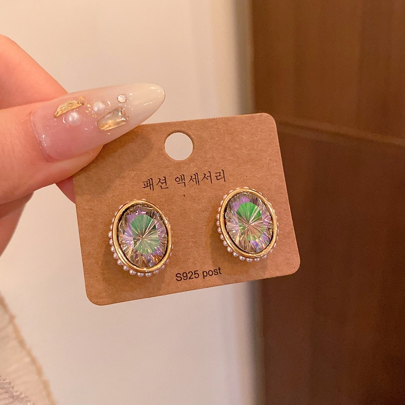 韓国風のレトロなカラーのダイヤモンドオーバルスタッドイヤリングパールで囲まれた高級感のあるスタイル
