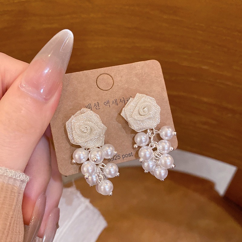 フレンチスタイルの高級ゴールドメッシュロングタッセルパールイヤリングファッショナブルで用途が広くエレガントなローズスタッドイヤリング