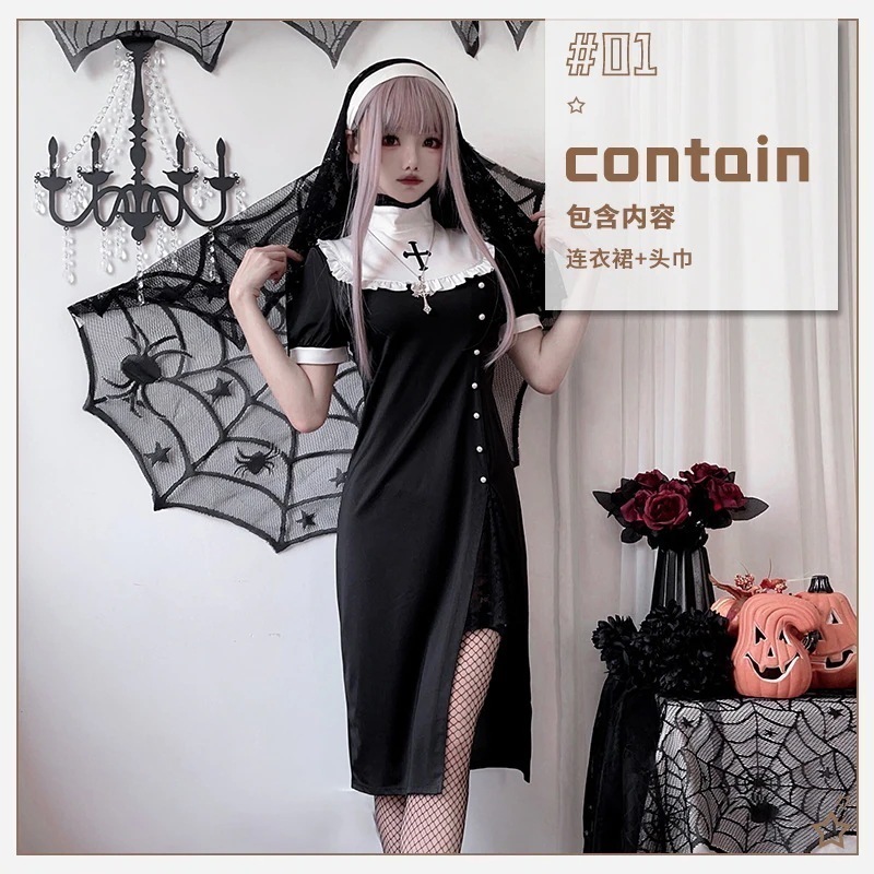 韓国ファッション ドレス コスプレ コス パフォーマンス衣装 ダークゴシック風 修道女衣装 ヴァンパイア ハロウィンコスチューム 万聖節 ロリータ クロススカート