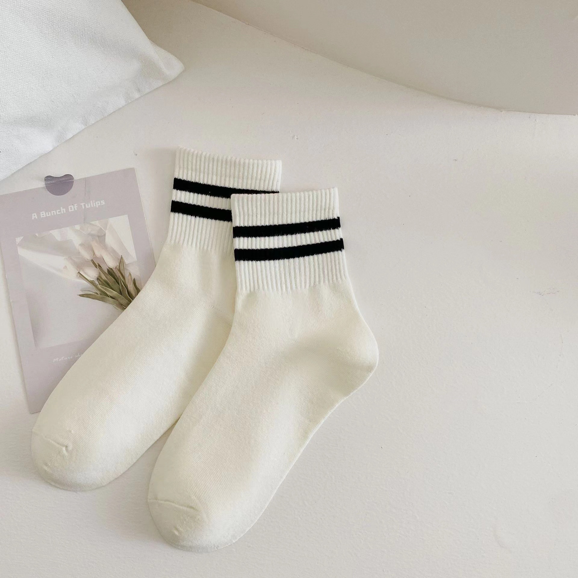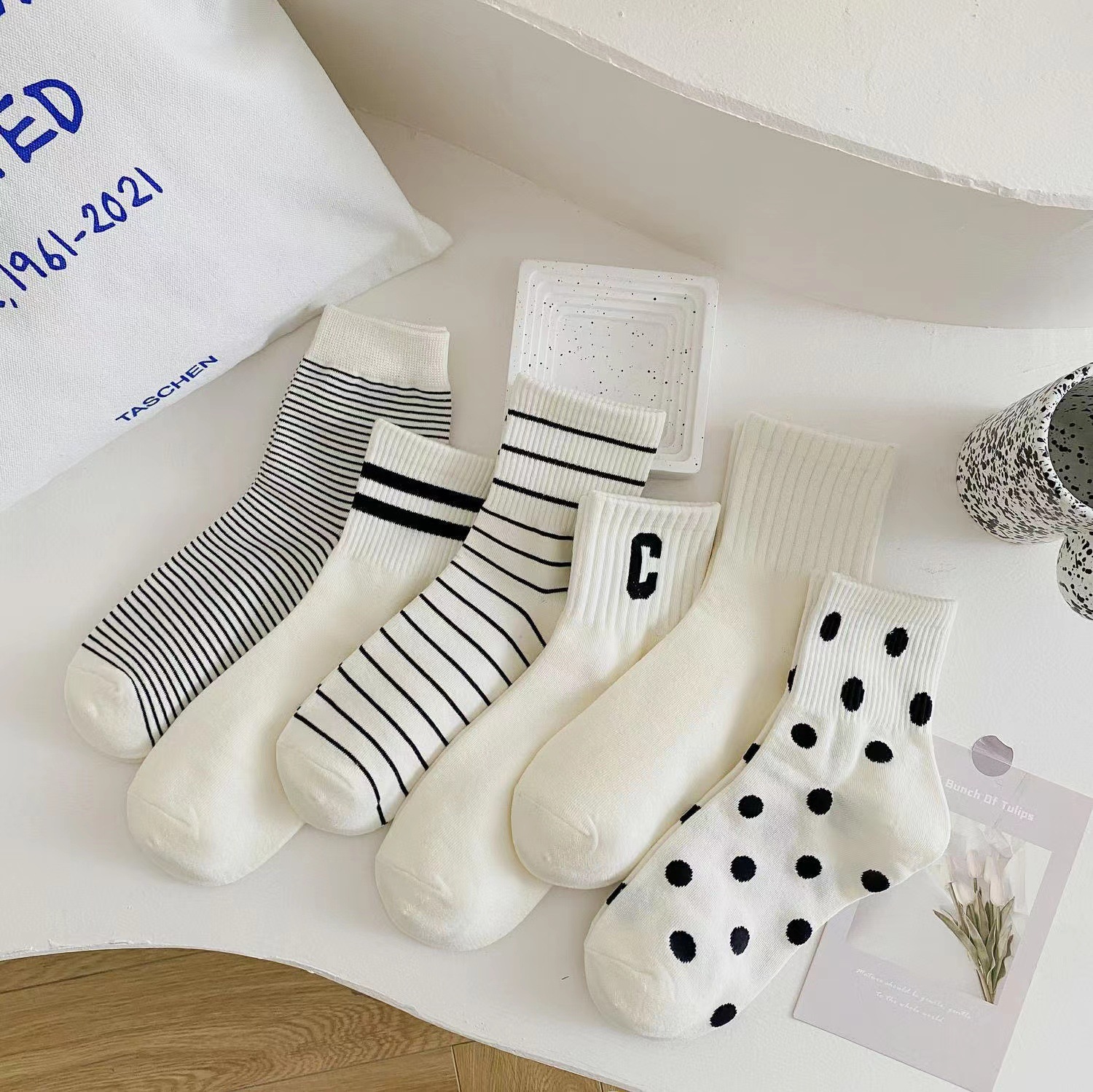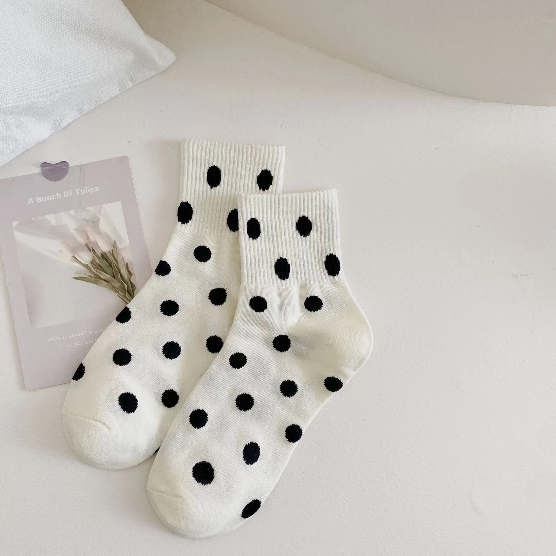 韓国風の春と秋の学生用ソックス女性用の黒と白のストライプ柄のふくらはぎ丈ソックス女性用の水玉模様の流行の白いスポーツソックス