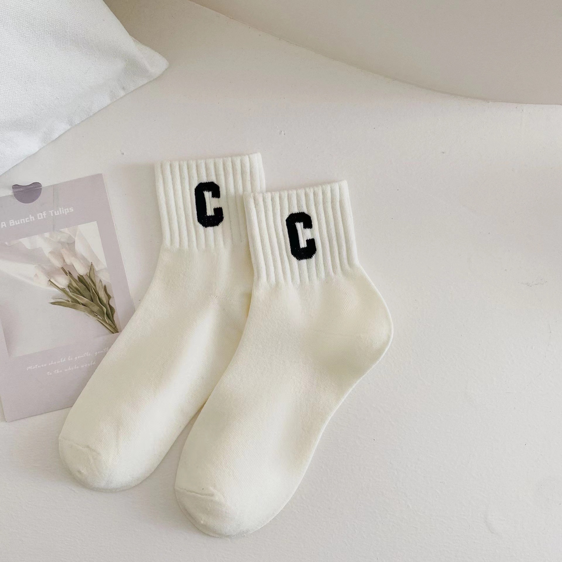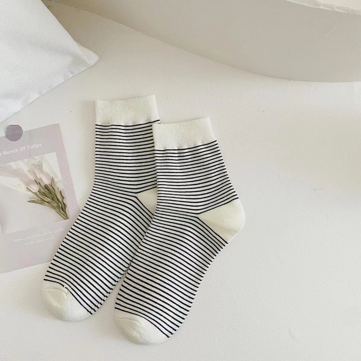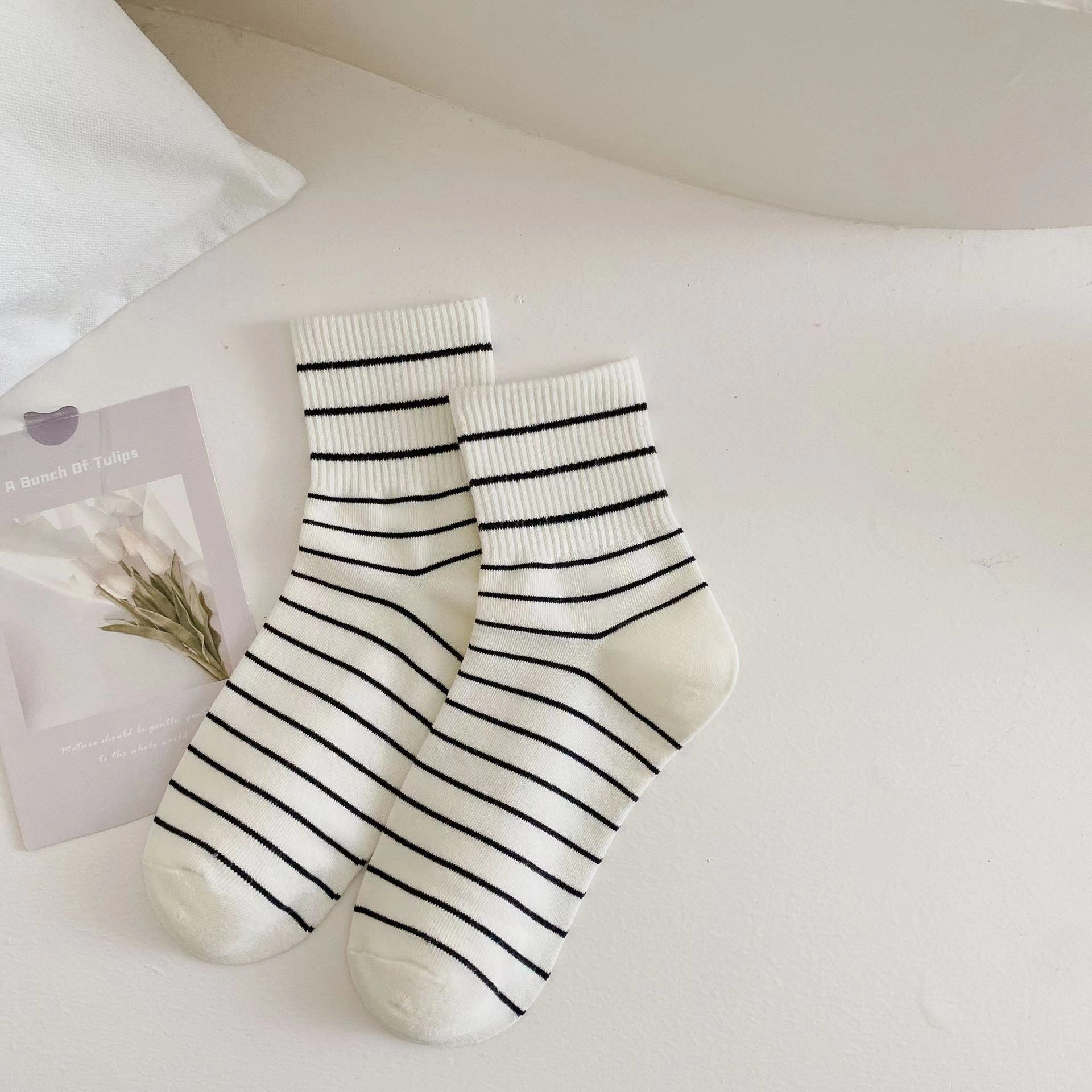 韓国風の春と秋の学生用ソックス女性用の黒と白のストライプ柄のふくらはぎ丈ソックス女性用の水玉模様の流行の白いスポーツソックス