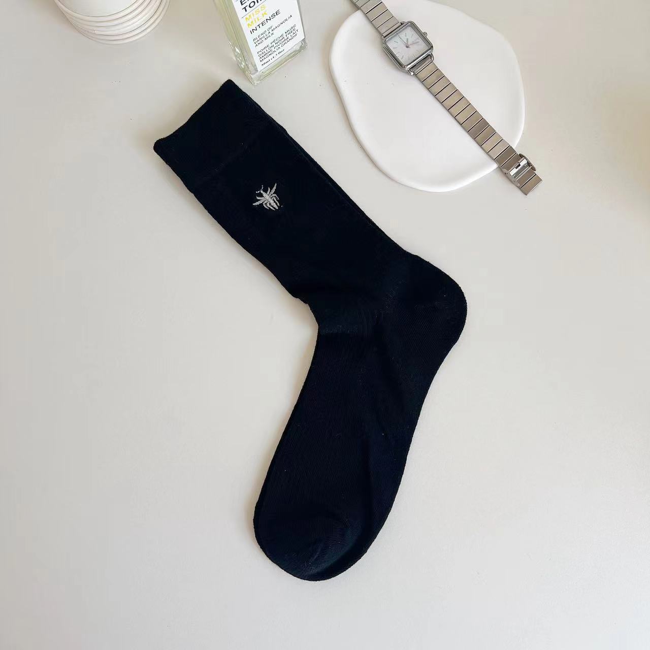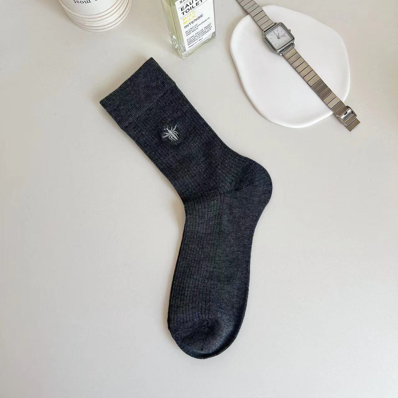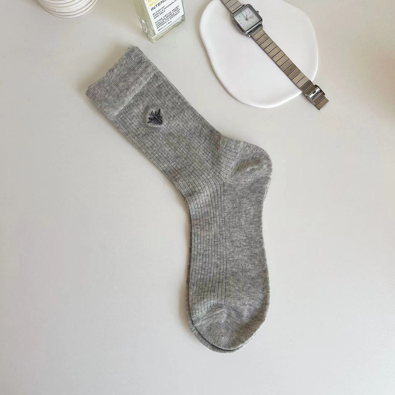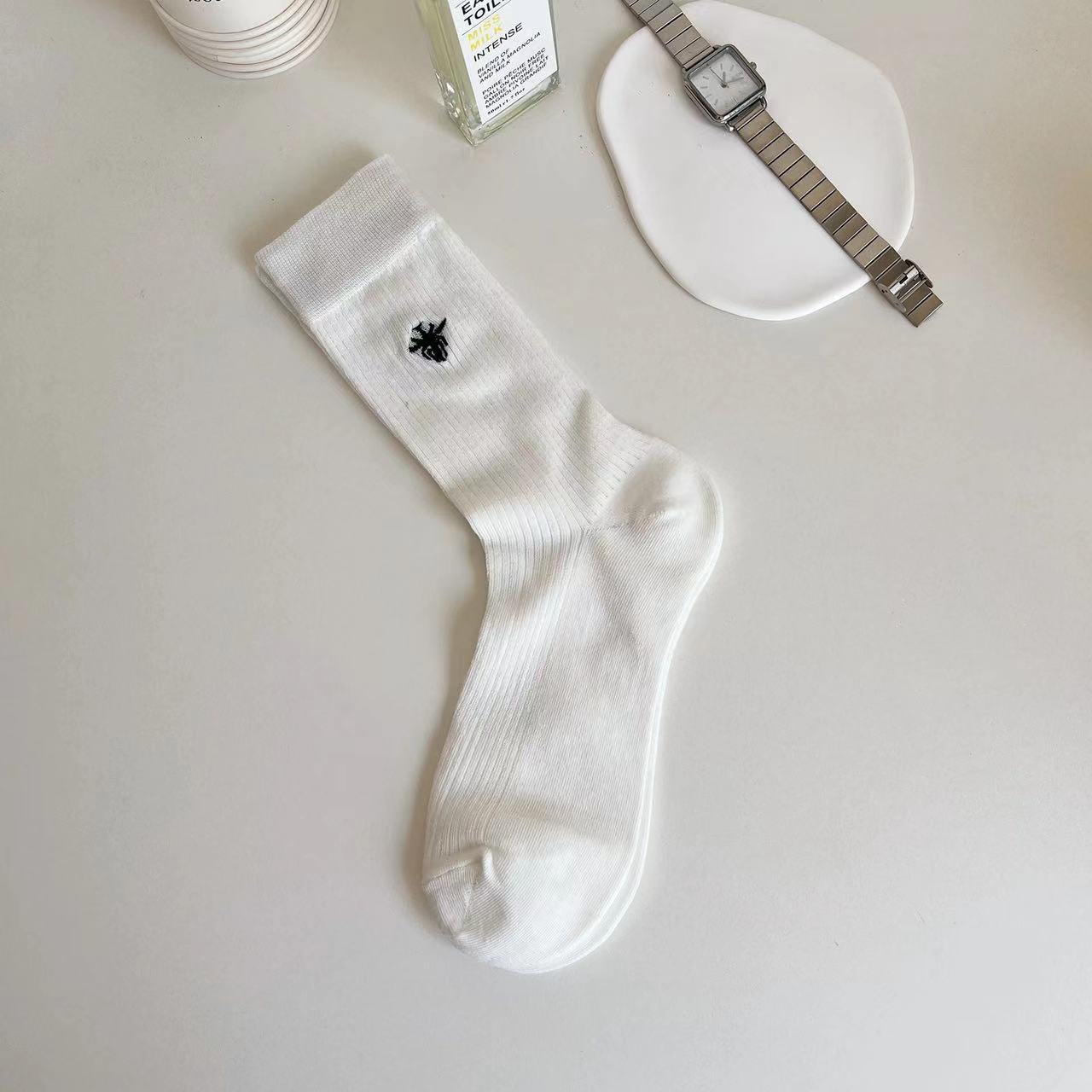 韓国風秋冬レディースソックス蜂の刺繍無地快適な縦縞日本風ミドルカーフスラウチソックス