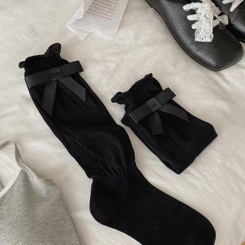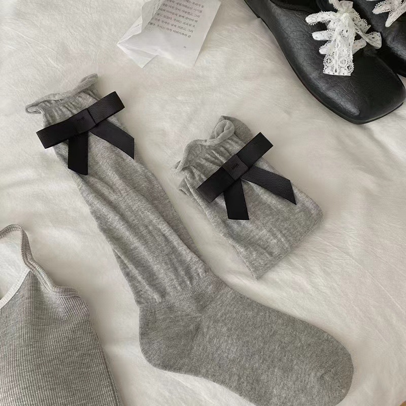 韓国風2025黒白グレーのリボンミドルカーフソックス白バレエ風ソックスプリンセス風の秋の新作トレンドソックス