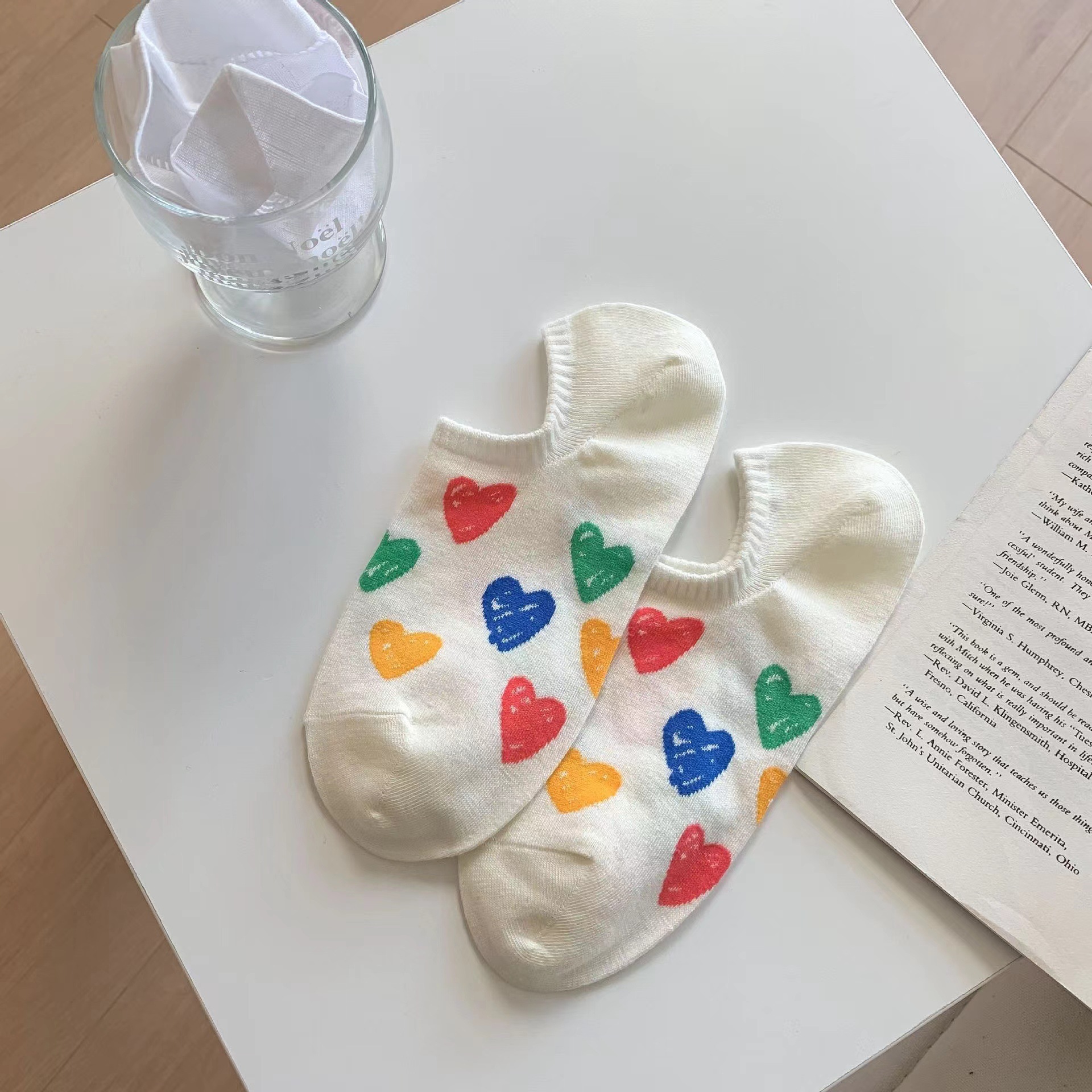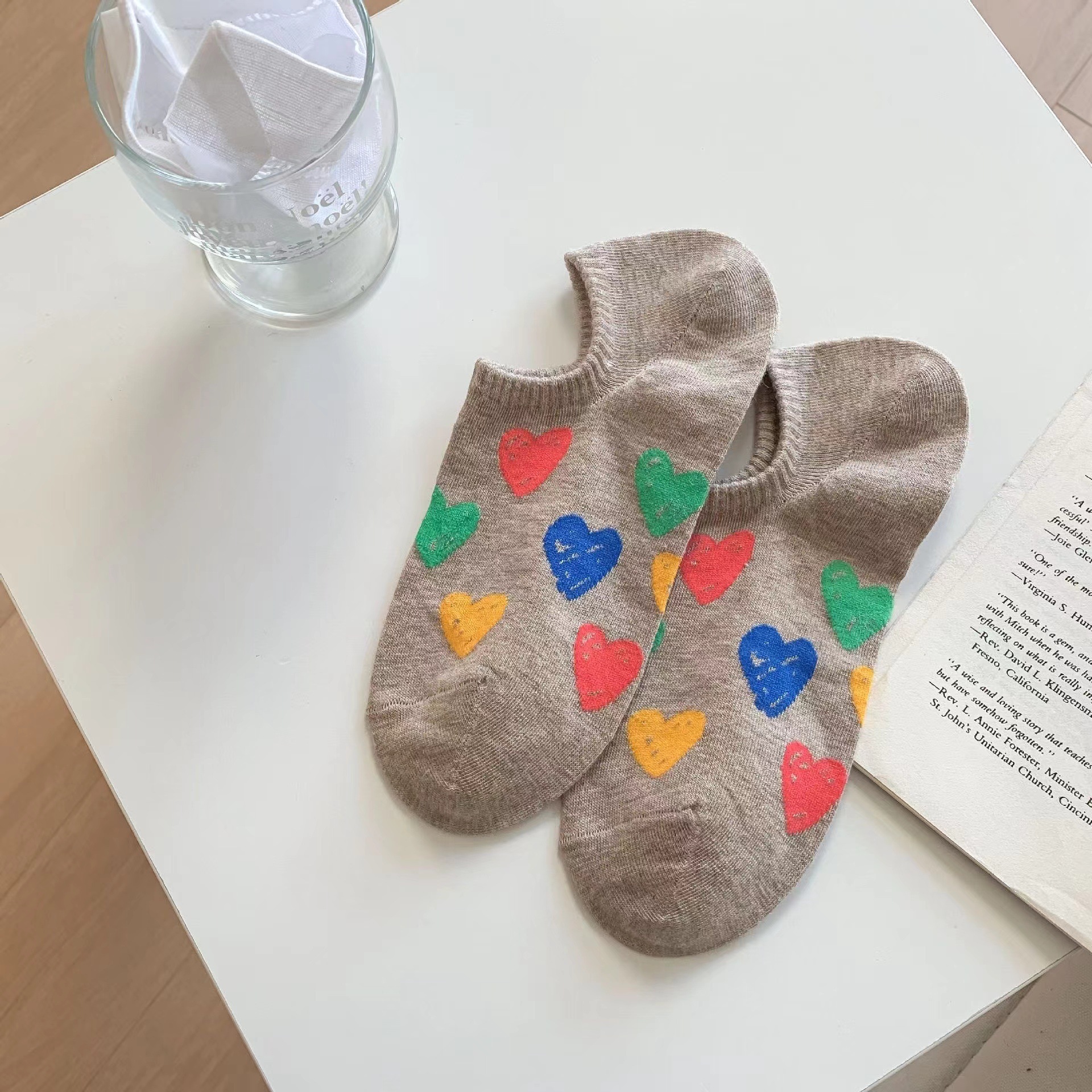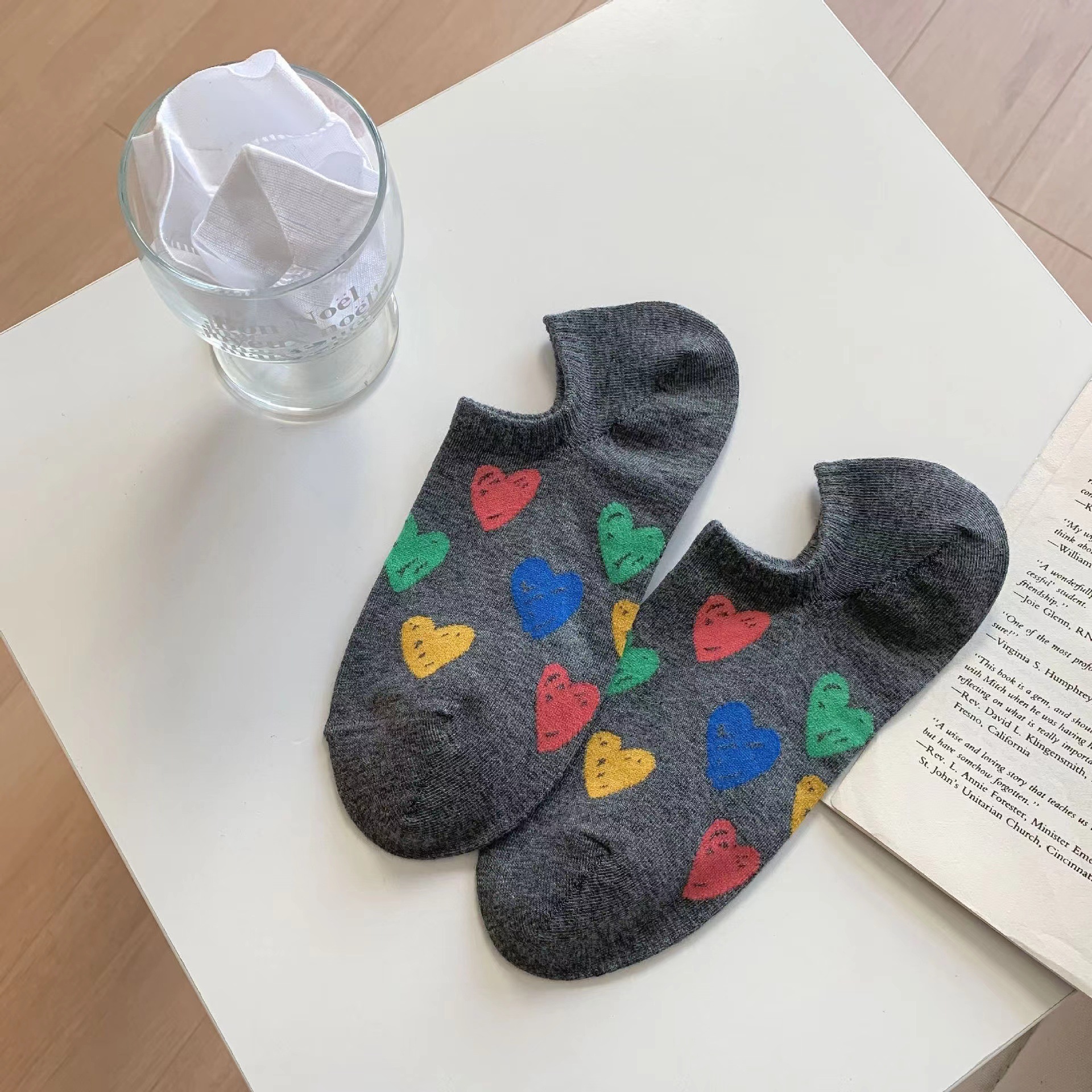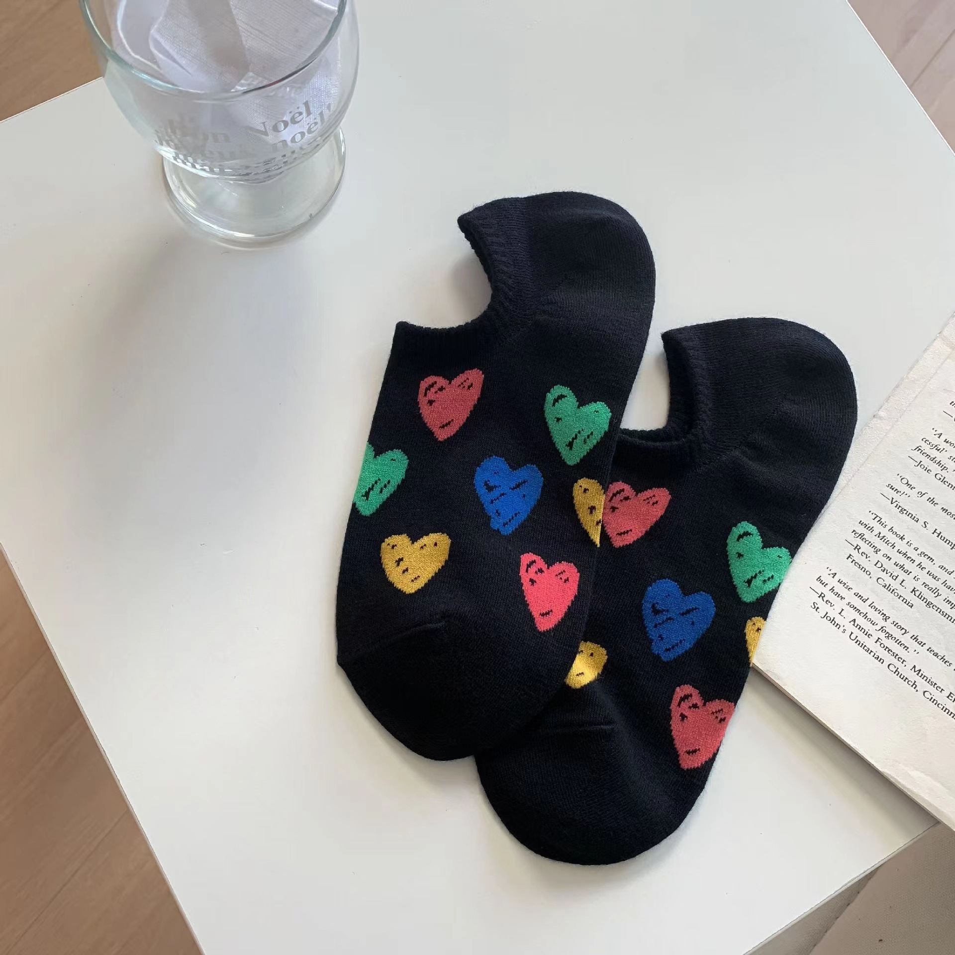 韓国風の夏用薄手ボートソックス女性用シリコン製滑り止め韓国風東大門風日本風カラフルな落書きハート柄のインビジブルソックス
