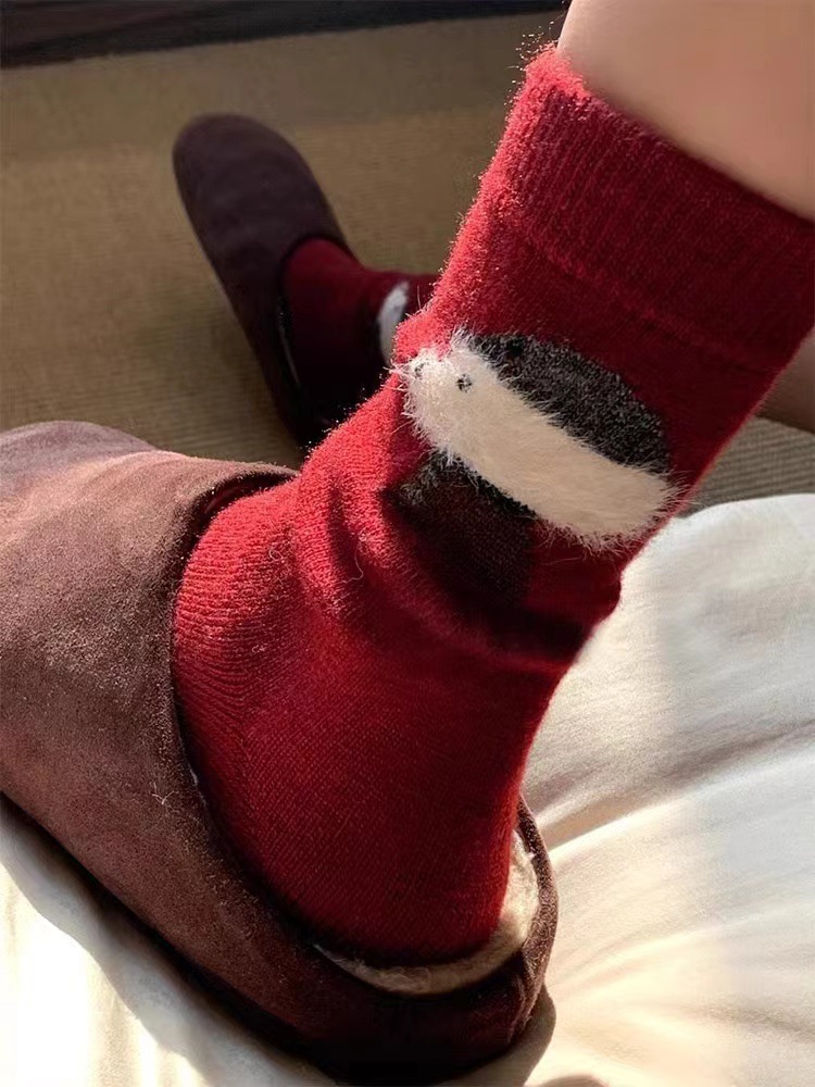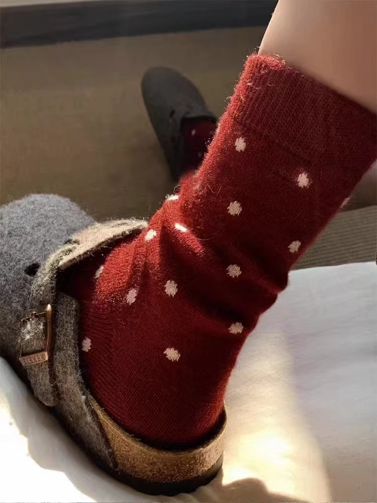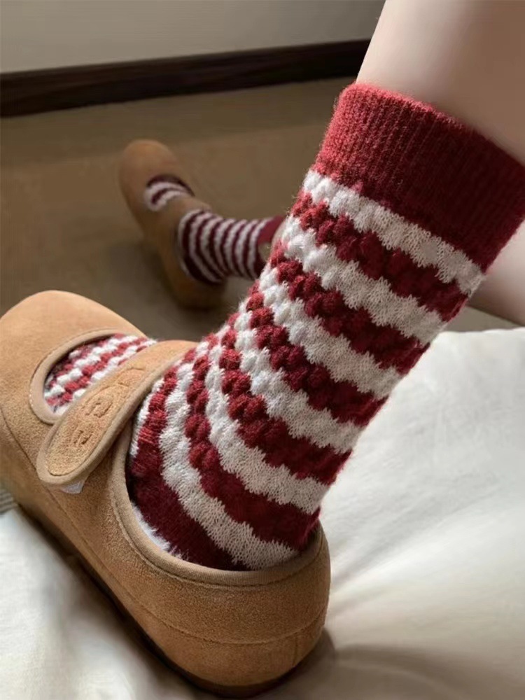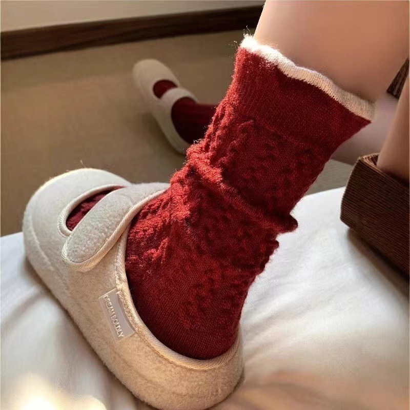 韓国風 2025 暖かい赤い女性用ソックス厚手でフリースの裏地が付いた赤いロングソックスケーブルニットのストライプ入り秋冬にぴったり