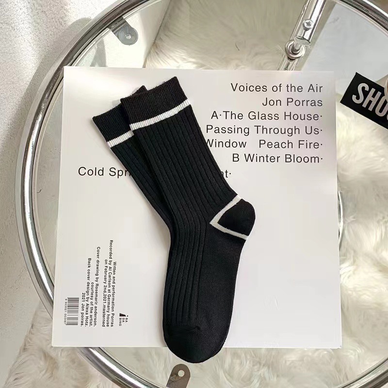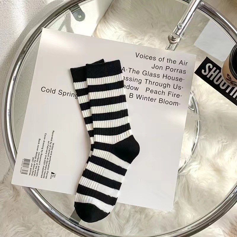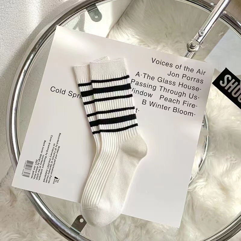 韓国風の白黒ストライプのレディースソックス2025年夏の薄手トレンドのミドル丈ソックス多用途のカジュアルな学生用スポーツソックス