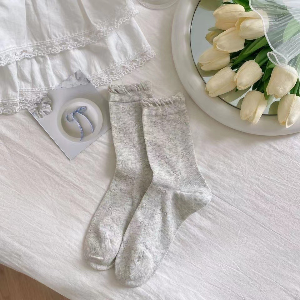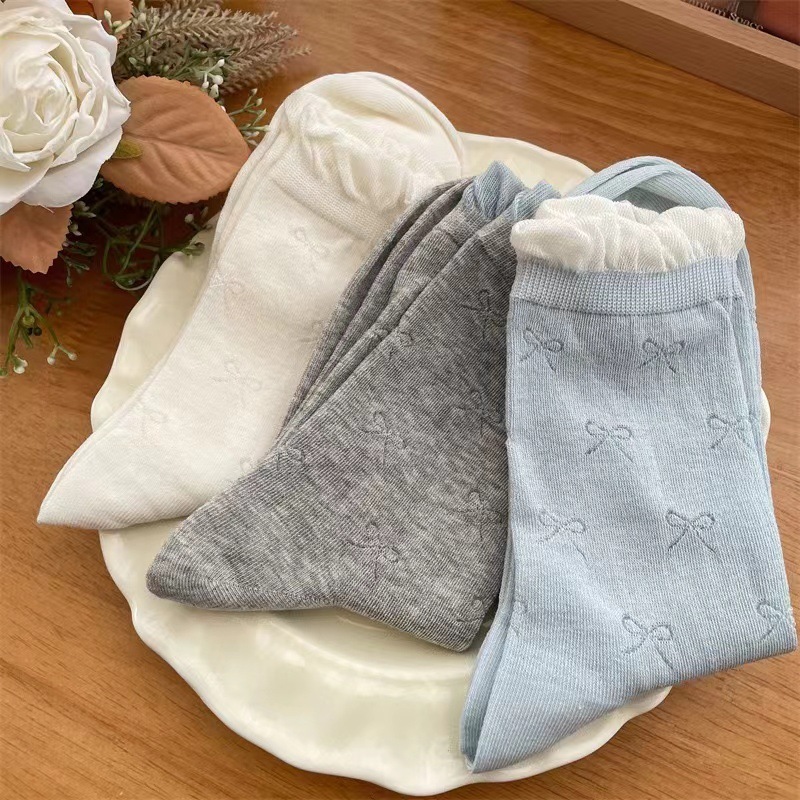 韓国風の秋の新着蝶ネクタイミュウ風レースソックスレディースミドルカーフソックスかわいいバブルマウス無地スラウチソックス