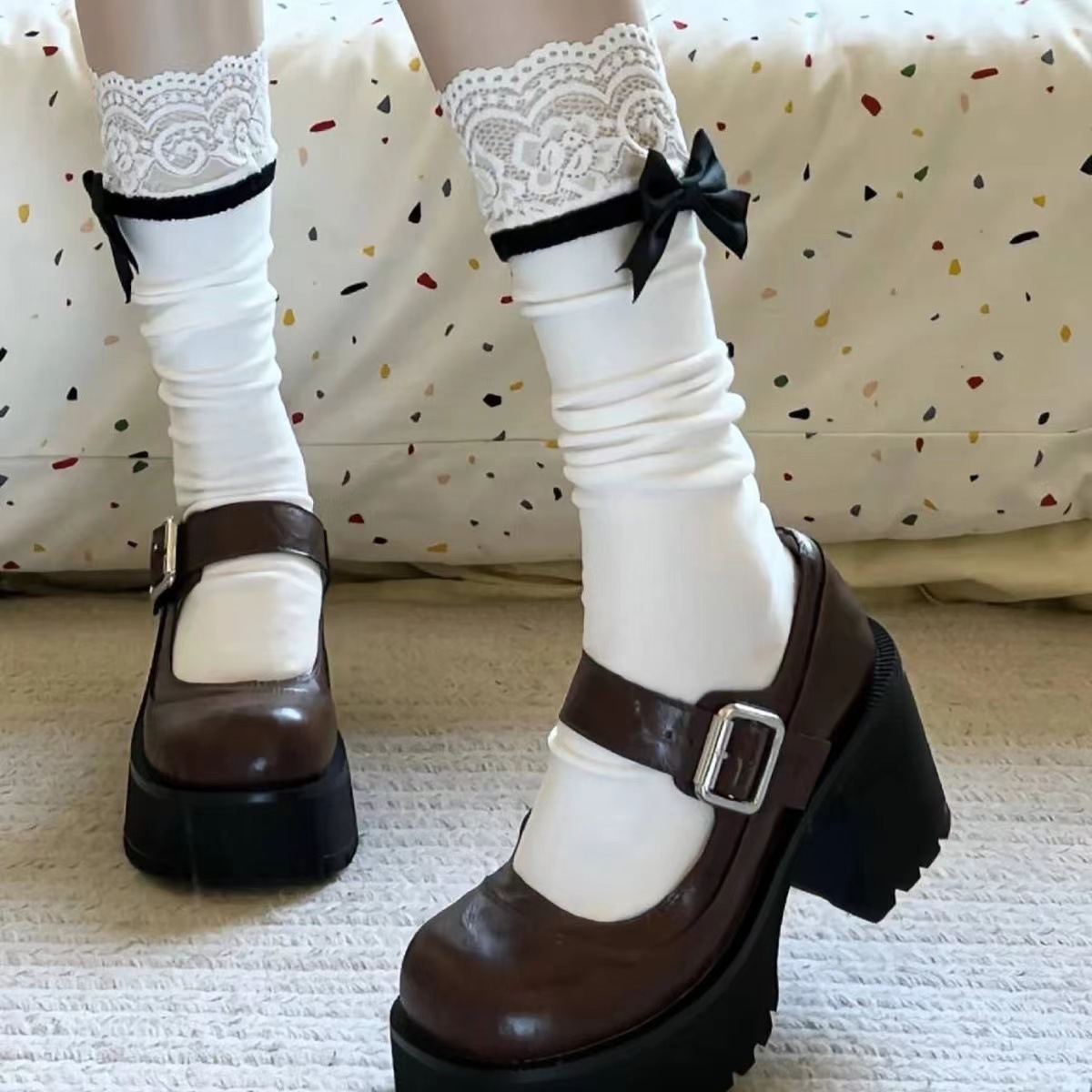 韓国風の蝶ネクタイ付きJKミドルカーフソックス純粋で魅惑的なレースのトリムが付いた多用途の日本風カーフソックスロリータメリージェーンソックス