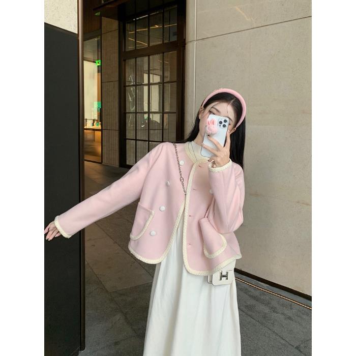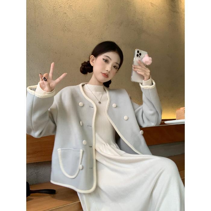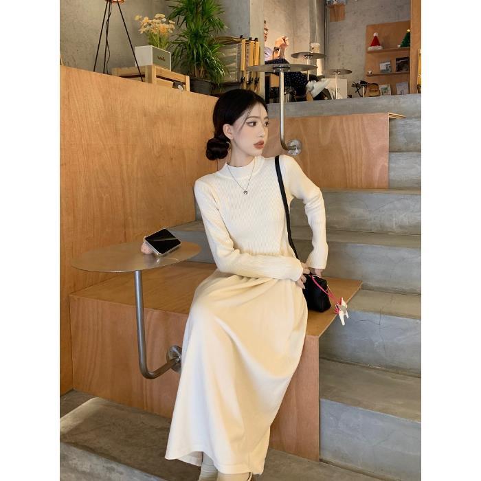 秋季レディースハーフハイネックニット長袖ワンピース + シャンソンスタイルウールブレンドアウター 新作トレンドファッションセット