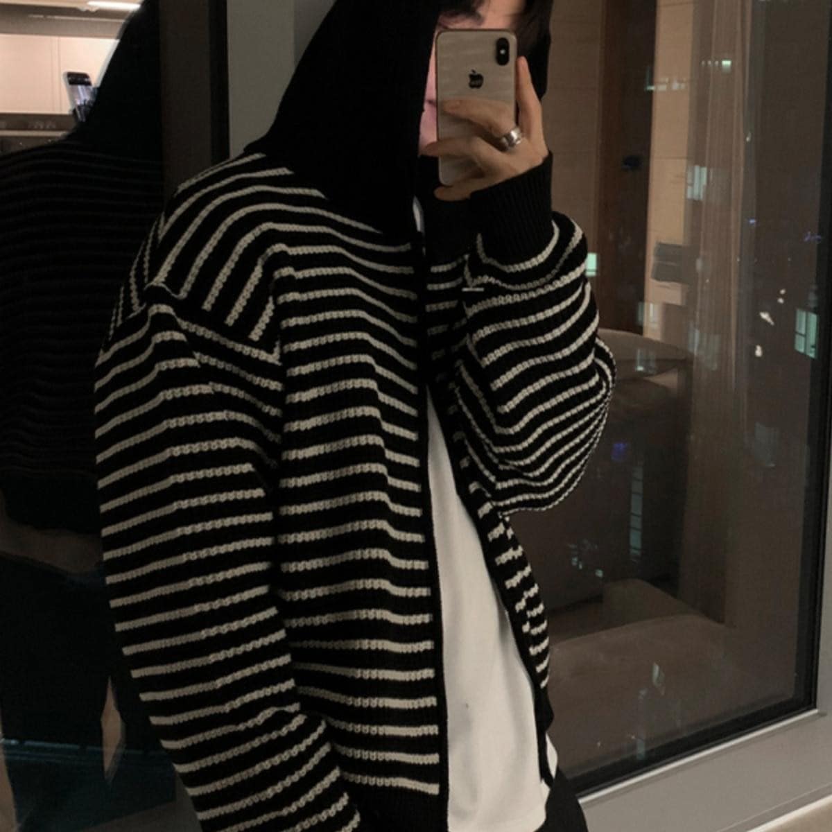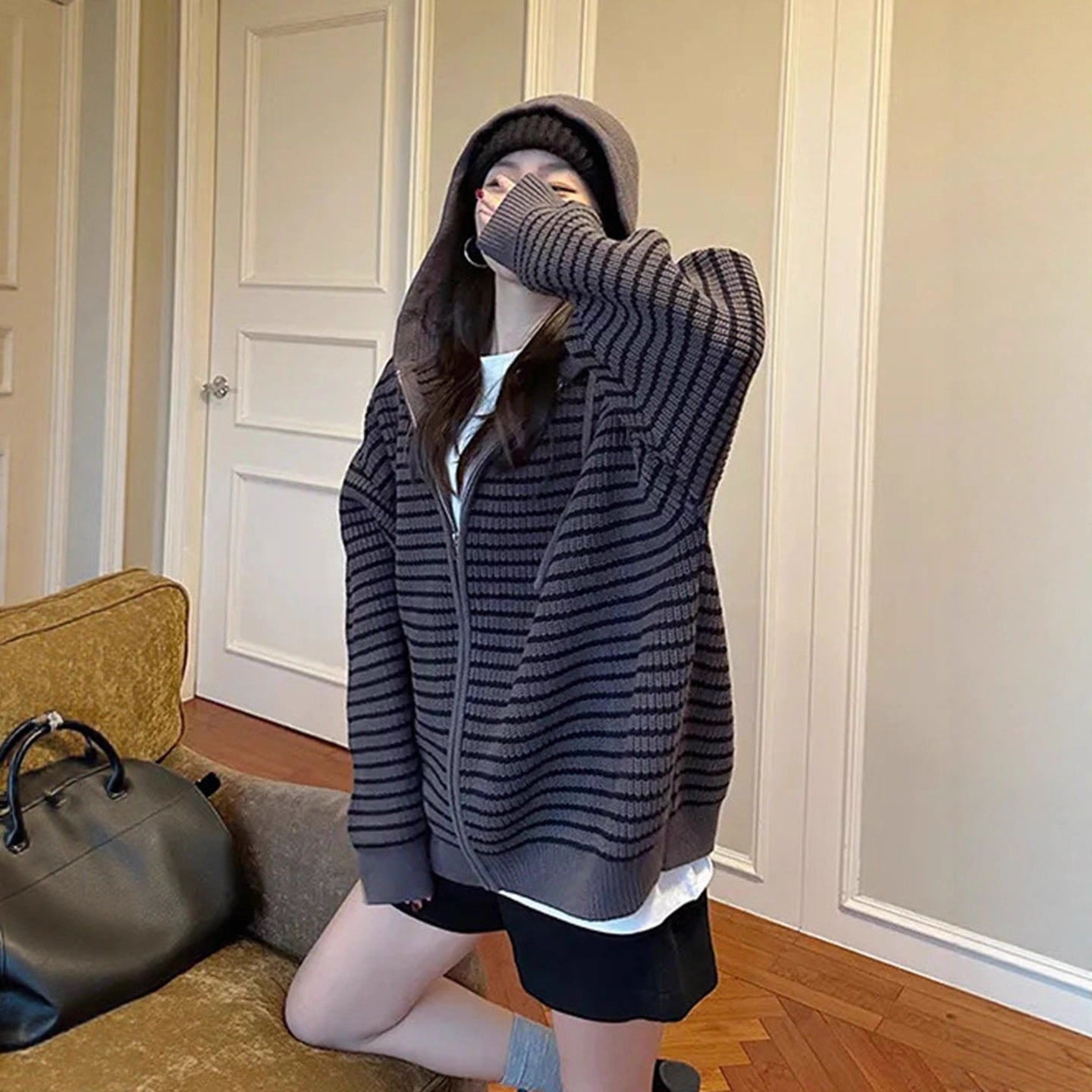レトロなユニセックスカラーブロックストライプフード付きニットジャケット 秋冬ゆったりカレッジスタイル 柔らかなジップアップカーディガン ニットカーディガン