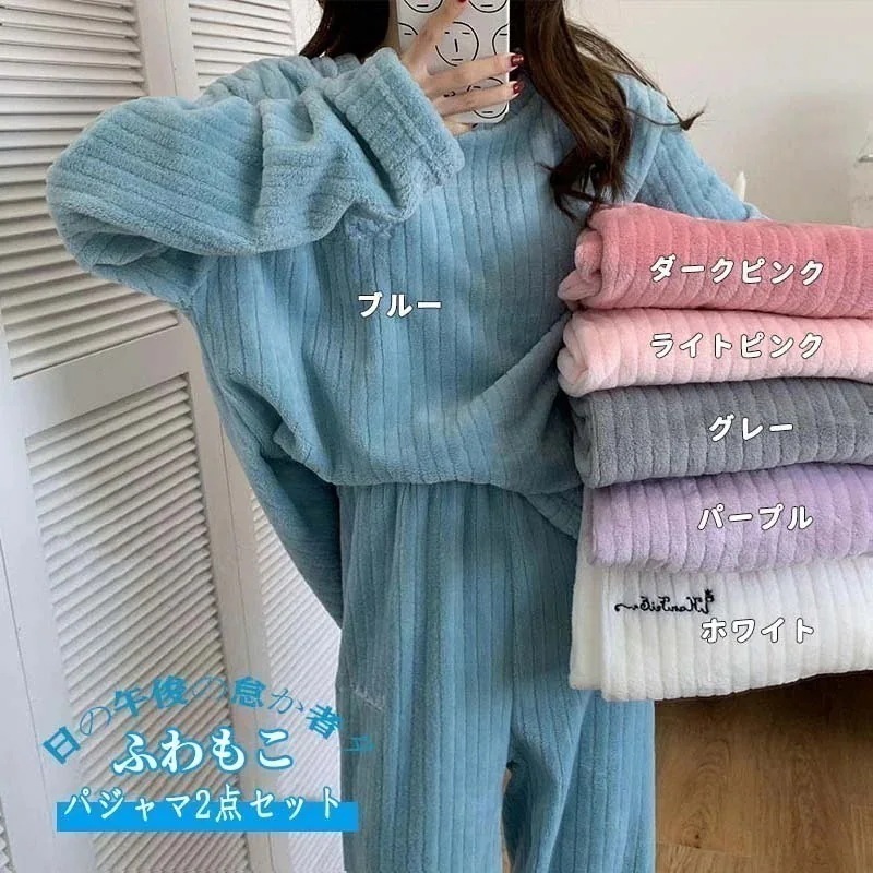 フランネル裏起毛で暖かい パジャマ レディース もこもこ かわいい 2点セット 上下セット
