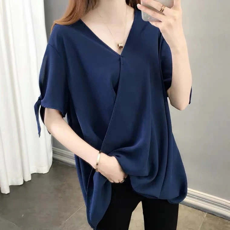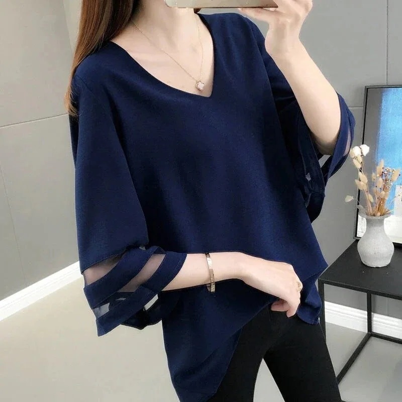 冷房対策 大きめサイズシアーシャツフレア袖 トップスゆったり百掛け着痩せVネックカジュアルシンプル
