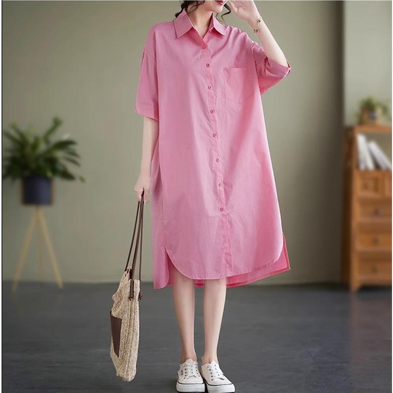 ロングシャツ レディース 人気トップス 半袖 夏 シャツワンピース 折り襟 品質いいな新品 膝丈 ゆったり身幅で体型カバー リラクシーな着心地 大人のこなれ感を演出