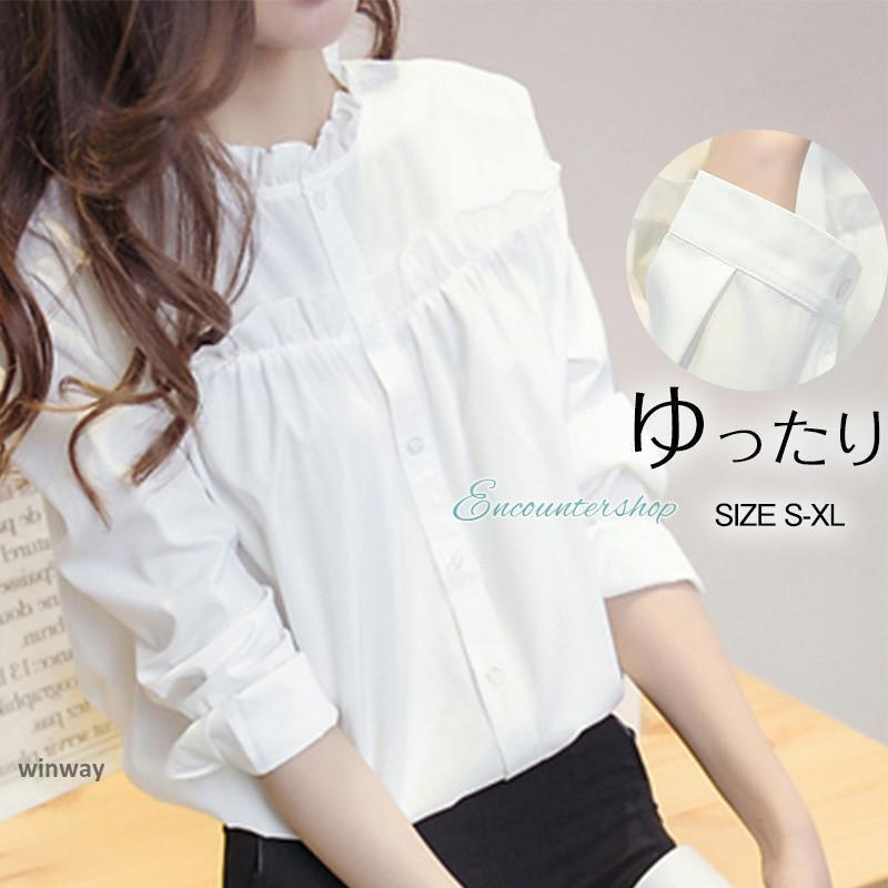シャツ ブラウス レディース トップス 長袖 綿 フリル フォーマル 製品気質 スタンドカラー フリルネック 白シャツ 着痩せ 通勤 OL 韓国風 おしゃれ