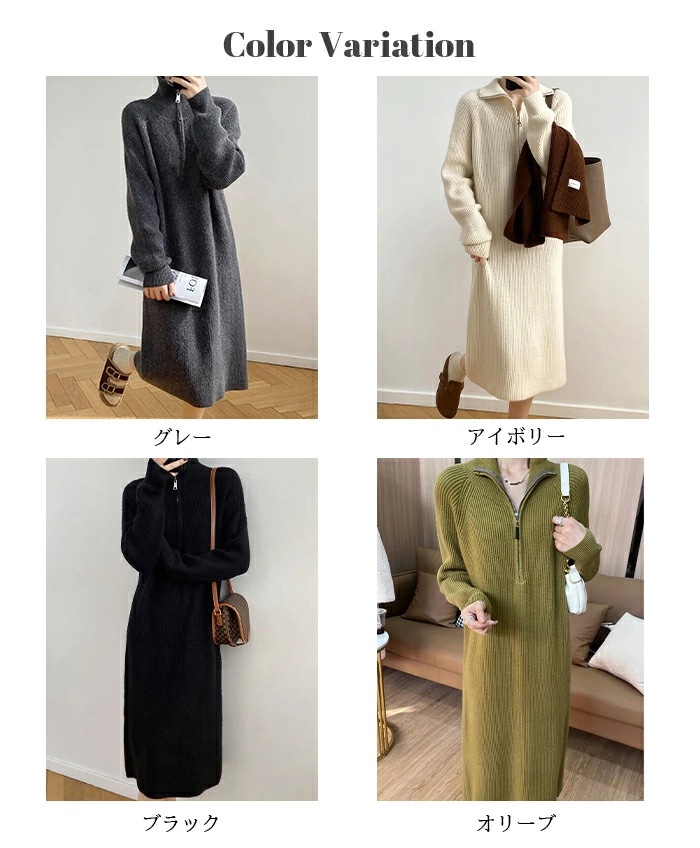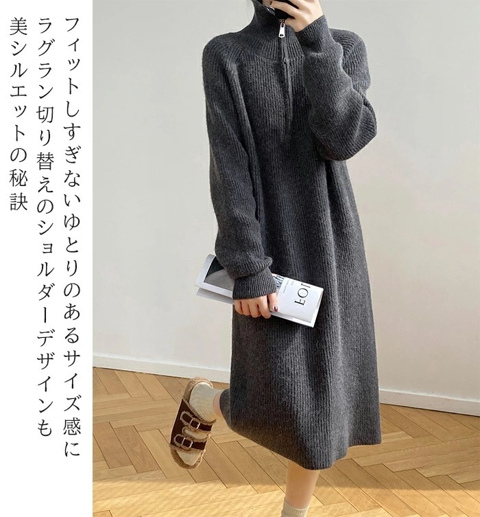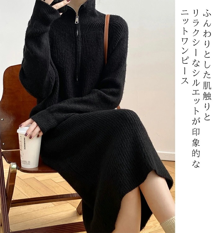 ワンピース ニットワンピース レディース 秋 冬 長袖 ハイネック Vネック ロング カジュアル ミディアム 楽ちん リブニット ゆったり ブラック FREE【ハーフジップニットワンピース】
