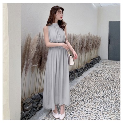 ワンピース レディース 夏 ロングワンピース ノースリーブ マキシ丈 無地 シフォン リゾートワンピ 体型カバー ベルト付 20代 40代